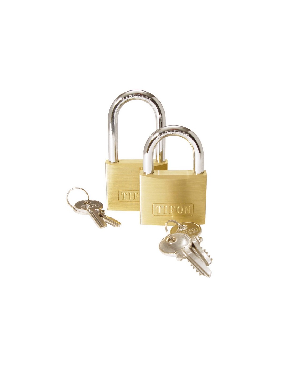 Arco largo. 50 mm. Arco largo. Candado tifón de latón con doble enganche y llaves estriadas.