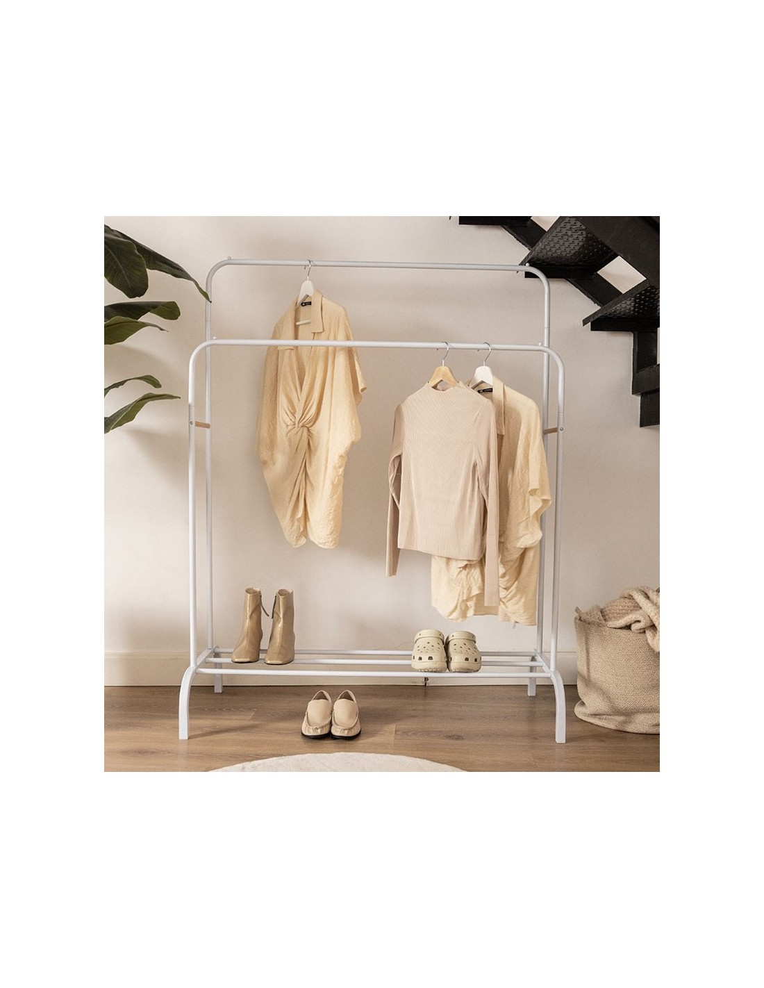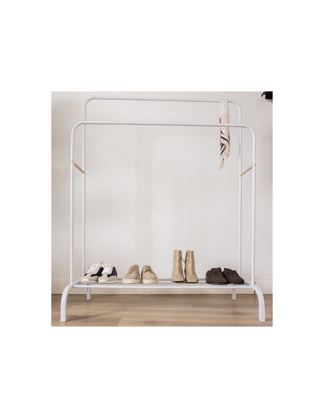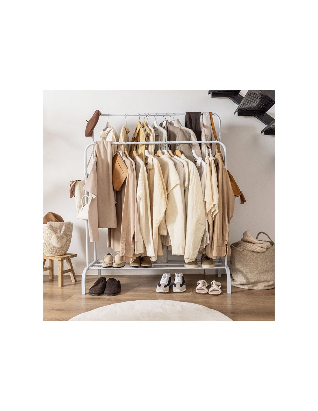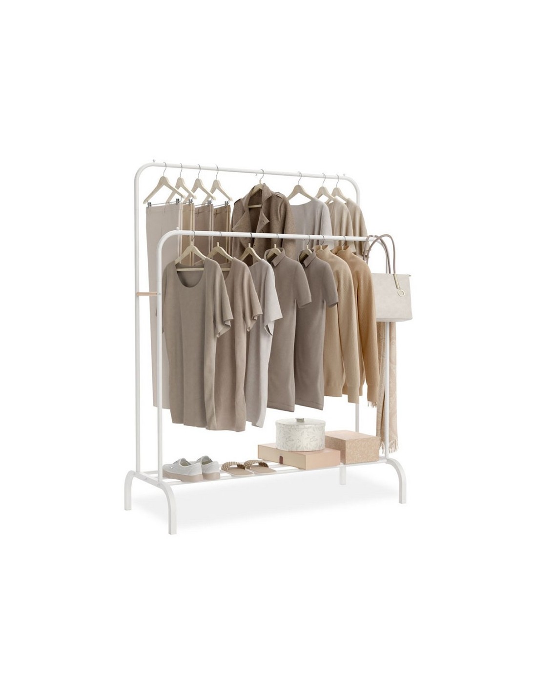 Perchero NEWLUX Hangy Duo 30 2 alturas: 131 y 101,5 cm. Ancho 92,5 cm. nivel 1 y 98,5 cm. nivel 2. Incluye zapatero: estante adicional en la parte inferior de 109,5 cm. Multifuncional: perchero, zapatero y tendedero de interior. Base antirayaduras y topes antideslizantes: incluye 4 almohadillas de protección. Diseño compacto y portátil. Fácil montaje. Soporta hasta 30 kg. Color blanco. 115x50x150 cm.