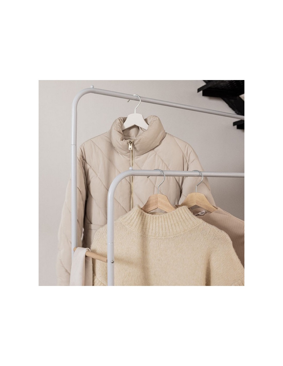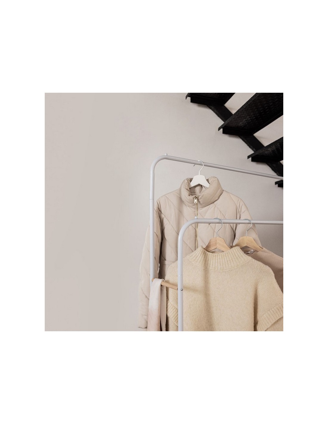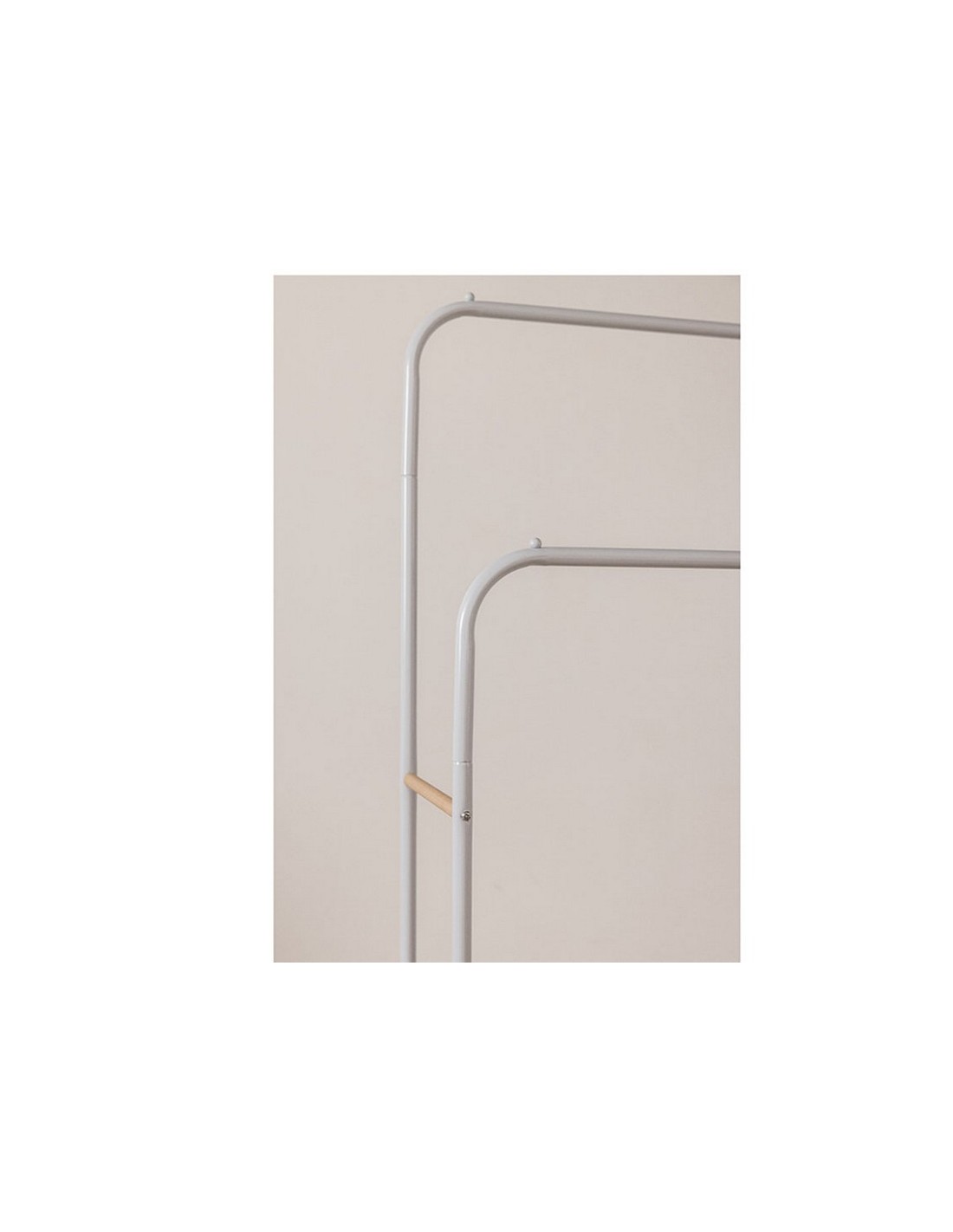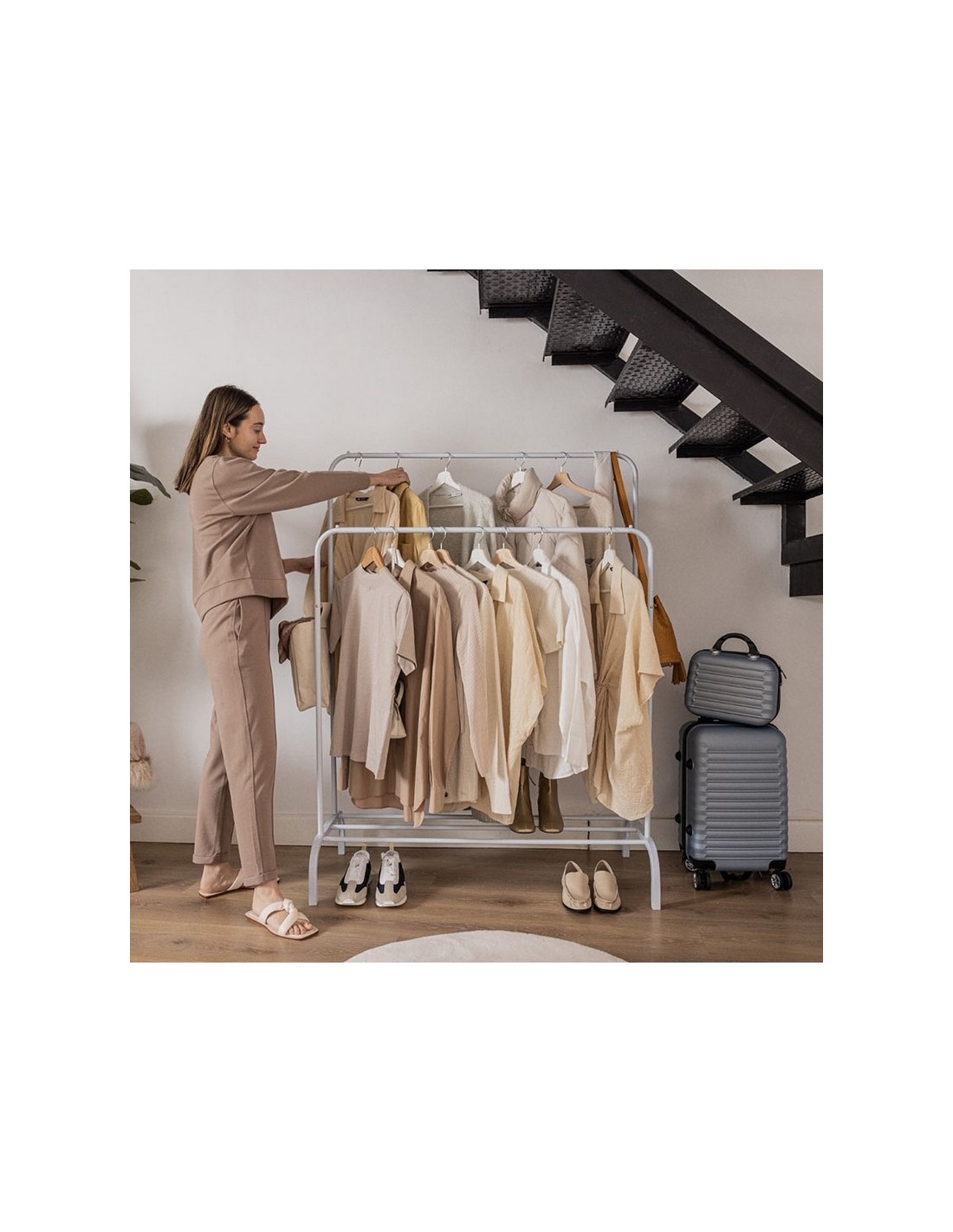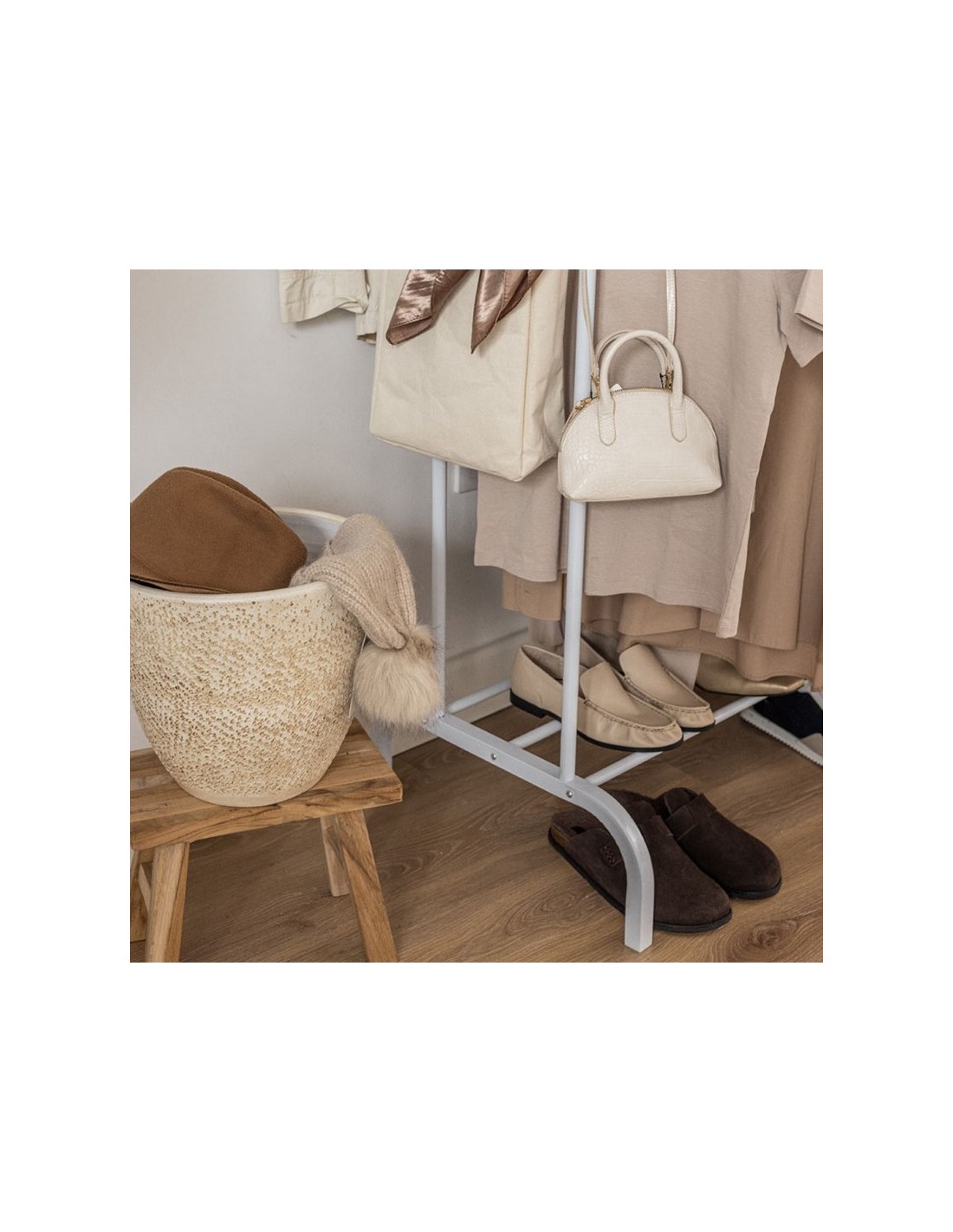 Perchero NEWLUX Hangy Duo 30 2 alturas: 131 y 101,5 cm. Ancho 92,5 cm. nivel 1 y 98,5 cm. nivel 2. Incluye zapatero: estante adicional en la parte inferior de 109,5 cm. Multifuncional: perchero, zapatero y tendedero de interior. Base antirayaduras y topes antideslizantes: incluye 4 almohadillas de protección. Diseño compacto y portátil. Fácil montaje. Soporta hasta 30 kg. Color blanco. 115x50x150 cm.