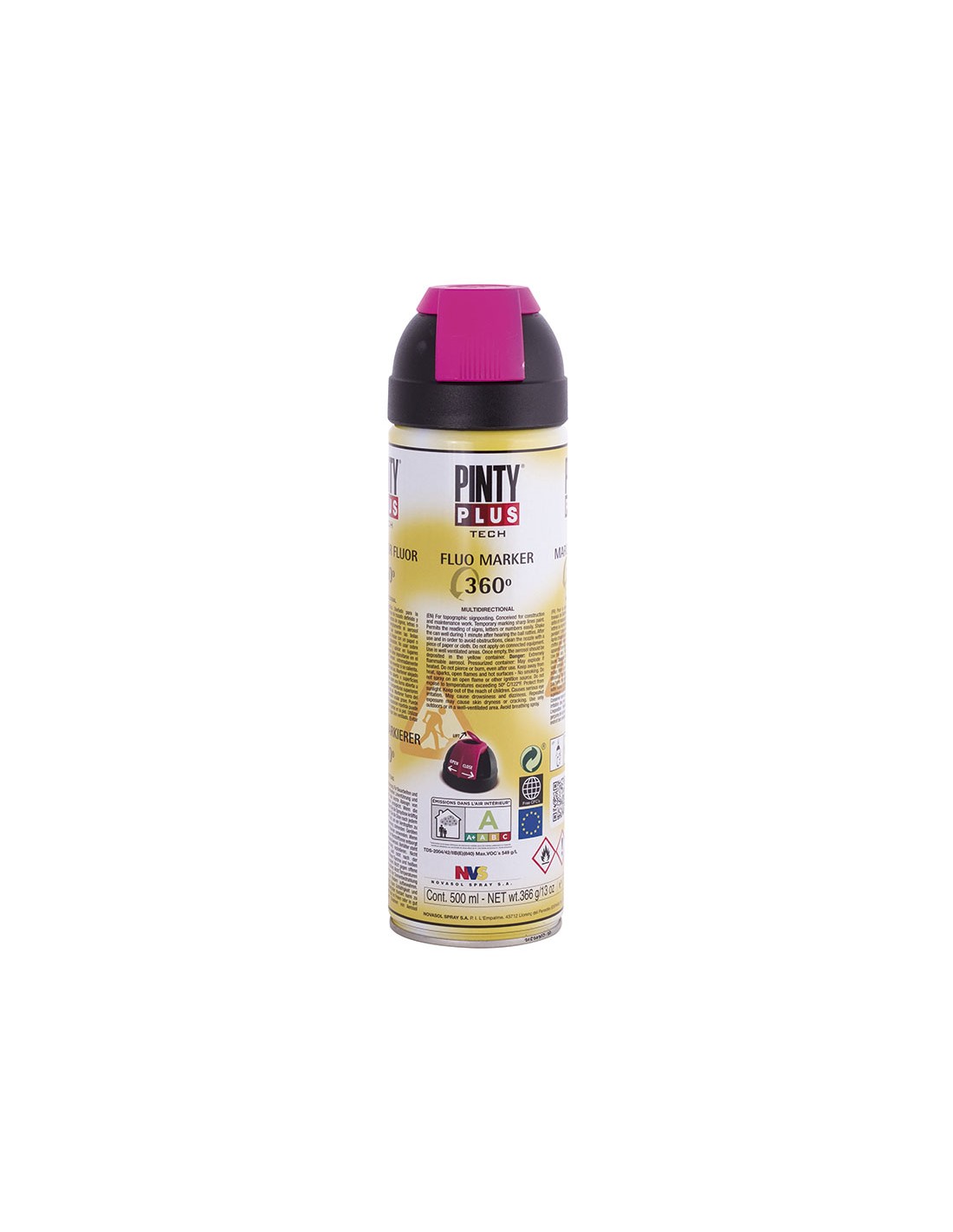 Pintura topográfica fluorescente NOVASOL Pintyplus Tech. Para señalización topográfica y marcado temporal sobre diferentes superficies.. Resistente a bajas temperaturas. Pintura muy visible que permite la lectura de signos, letras o números con facilidad. Colores fluorescentes mates de alta luminosidad. Vá Rojo cereza 400 ml.
