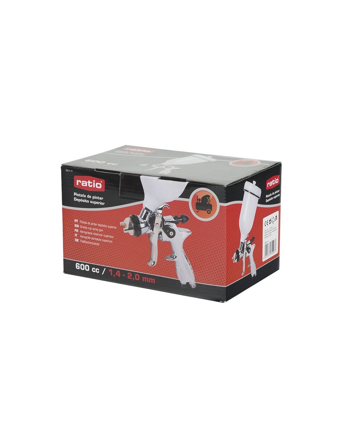 Pistola de pintar RATIO 696-14 Depósito superior. Enchufe rápido 1/4". Regulador de abanico, de aire y de flujo de producto. Depósito: 600 cc.