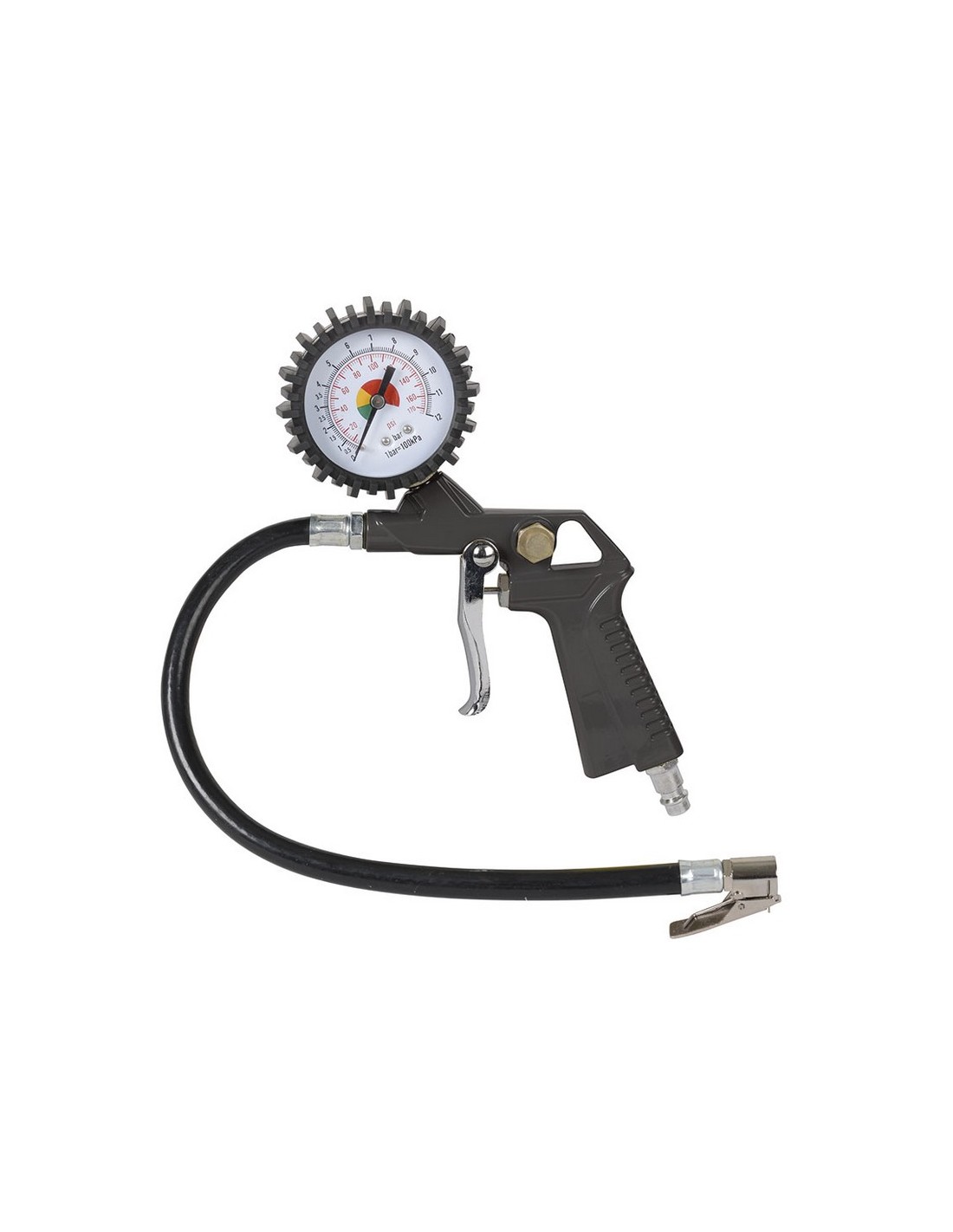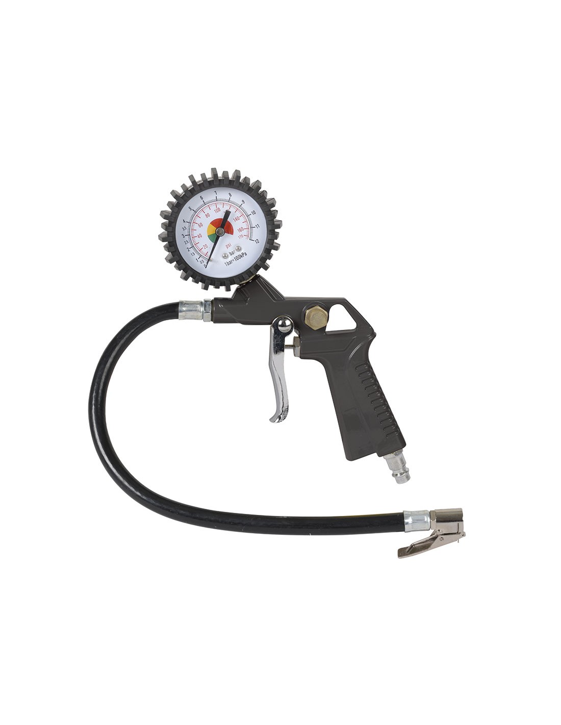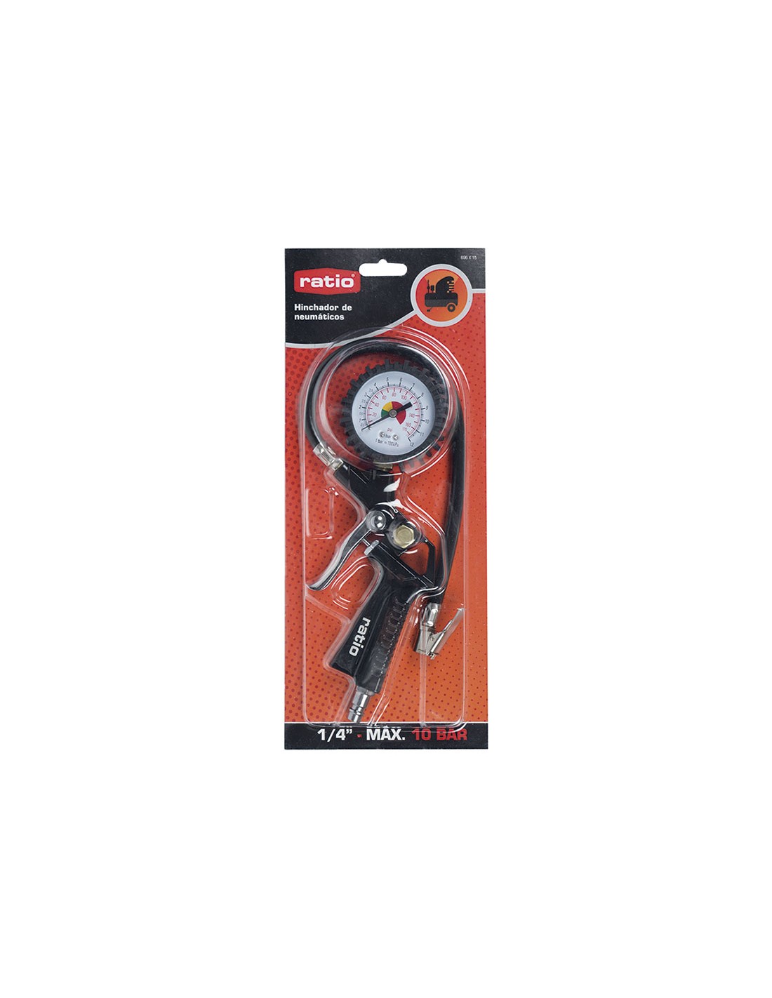 Hinchador neumático RATIO 696-15 Manómetro doble escala PSI/Bar. Enchufe rápido 1/4". Extremo de goma flexible. Presión máxima 10 Bar.