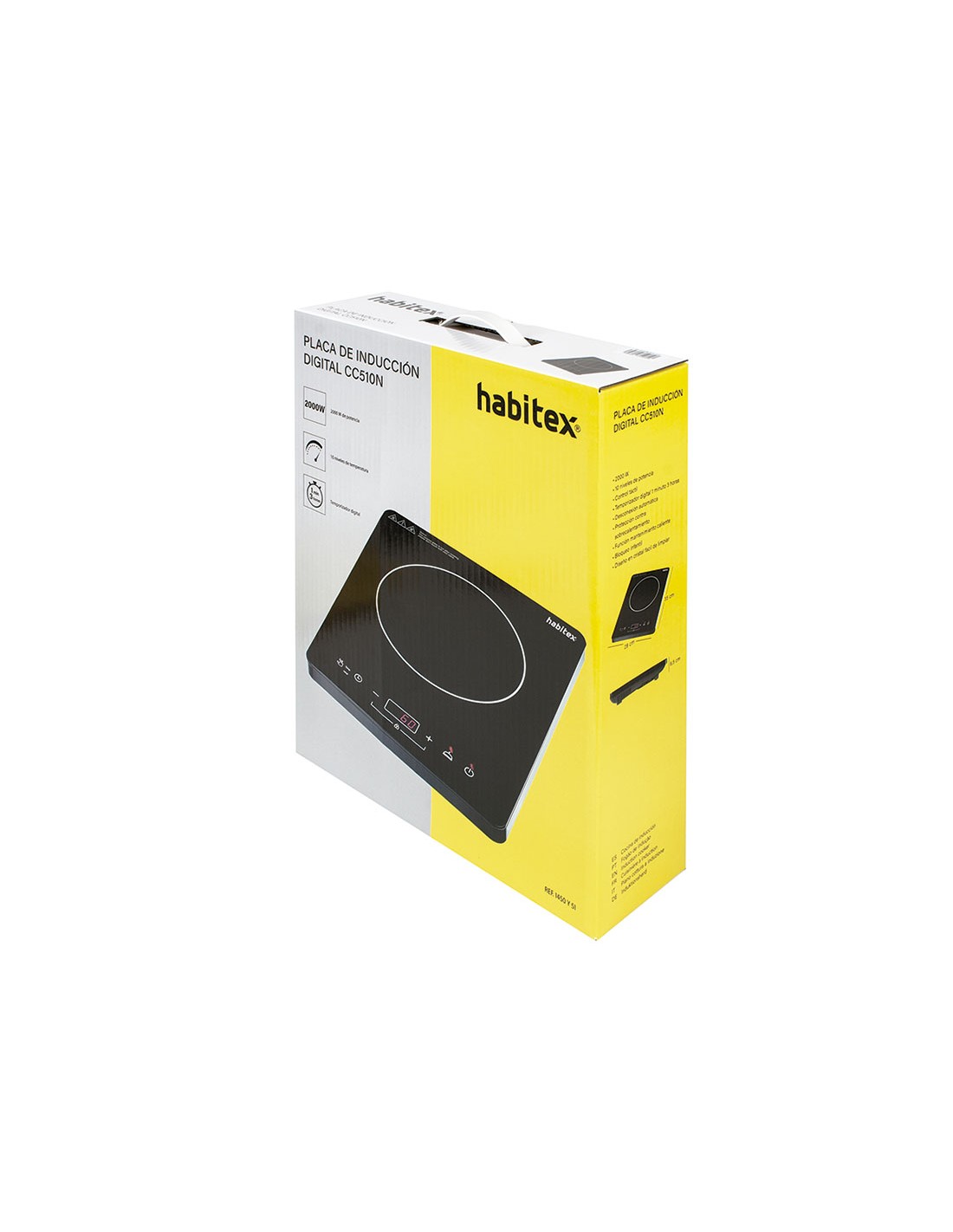 Placa portátil de inducción digital HABITEX CC510N. 10 niveles de potencia. Temporizador digital 180 min. Desconexión automática. Protección contra el sobrecalentamiento. Función de mantenimiento caliente. Bloqueo infantil. Diseño en cristal, fácil de limpiar. Potencia: 2.000 W.