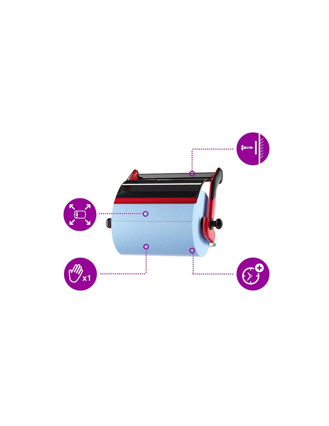 Portarollo de pared bobinas papel TORK W1 Estructura metálica rojo/negro. Con bisel de corte. 46,3x6,4x27,4 cm.