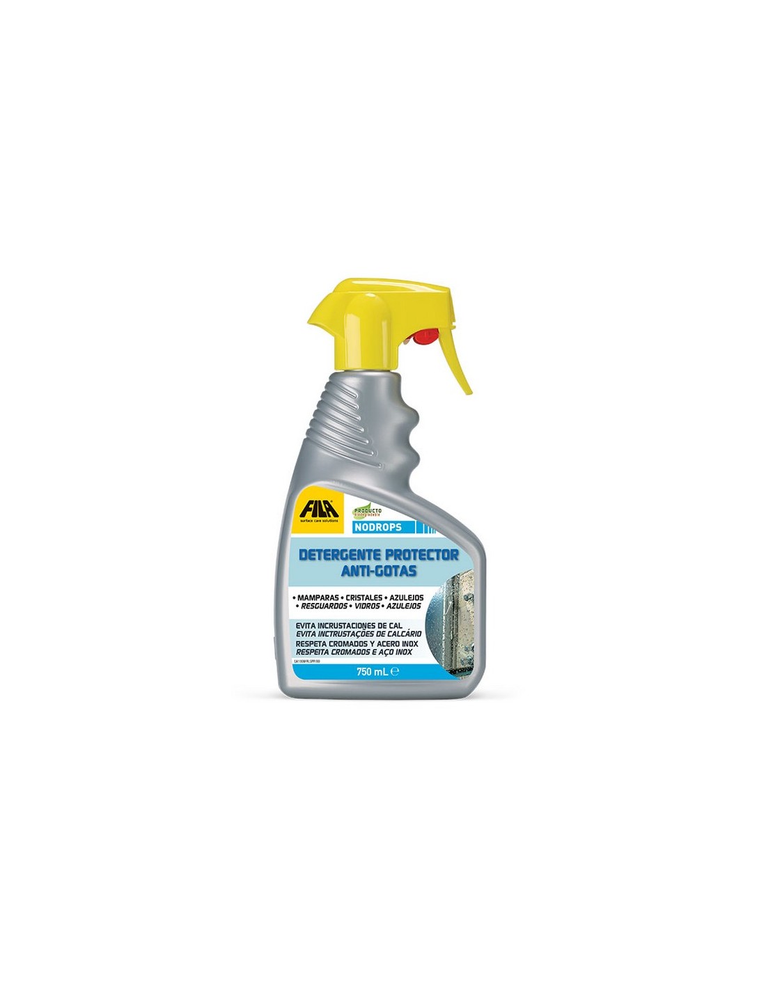 FILADetergente protector anti-gotas FILA NoDrops Limpia, protege, evita gotas, cercos cal. Superficies hidrófilas: el agua desliza sin dejar marcas. Fórmula ecológica y no ácida. Ideal mamparas, grifos, acero, plexiglass, espejos, gresite.con pulverizador. 750 ml.