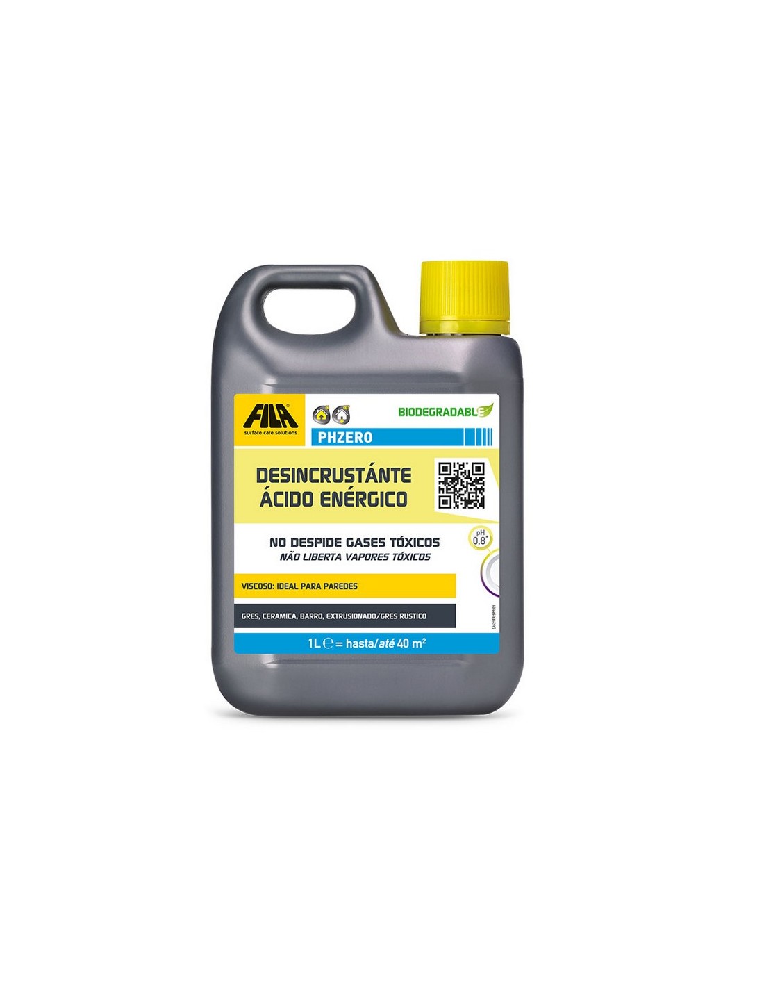 FILADesincrustante ácido FILA PH Zero Elimina restos obra, eflorescencias. Limpia, desincrusta suelos porosos. No desprende gases tóxicos. Acción prolongada. Rendimiento: 20 m² barro, 40 m² porcelánico por litro aplicado. 1 litro.