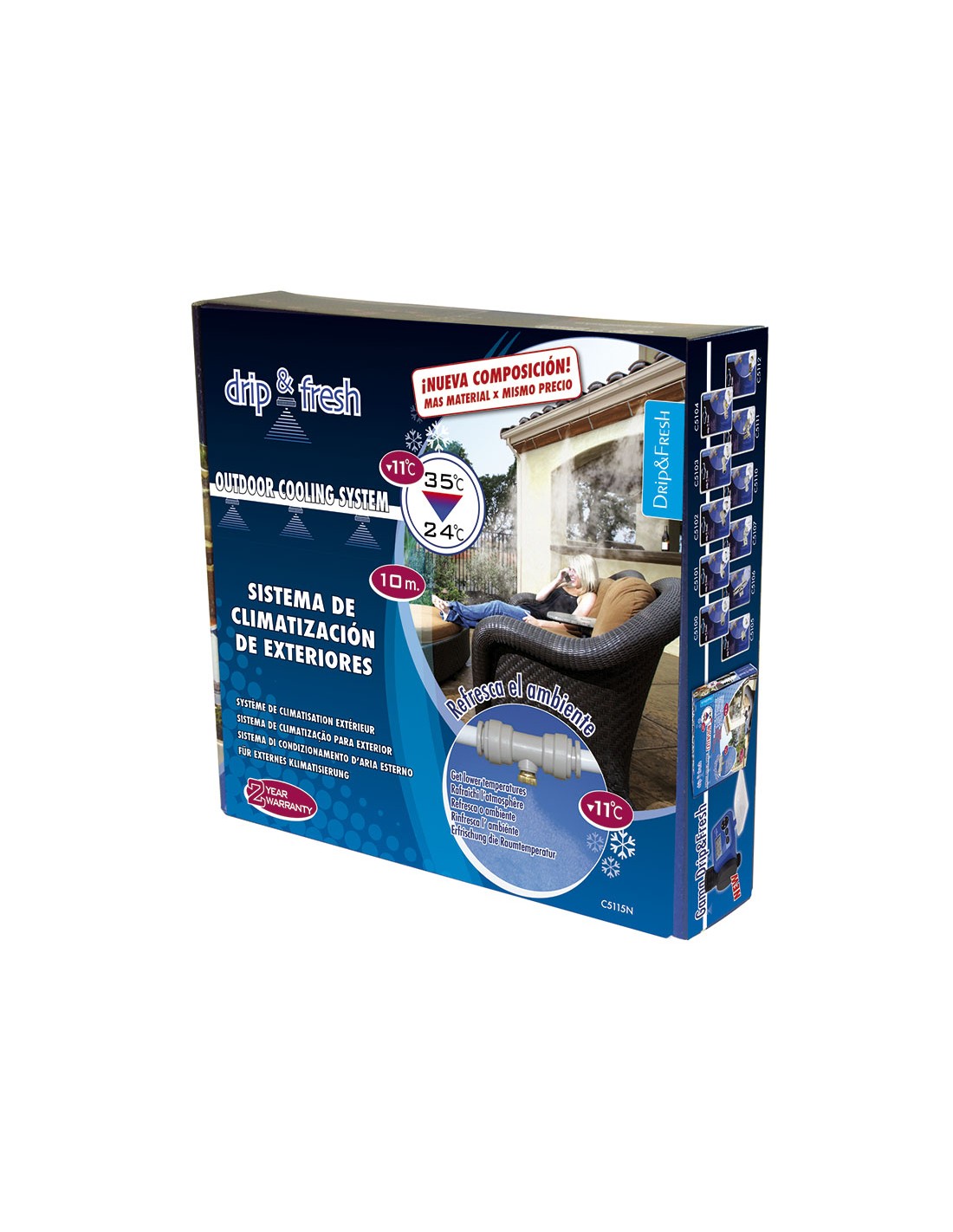 Kit sistema nebulización ALTADEX Drip&fresh Instalación uso exterior, patios, terrazas, jardines. Dispone de adaptador grifo, 2 codos, 1 tapón final y 15 grapas sujeción. Incluye 10 m tubo. 10 m de tubo.