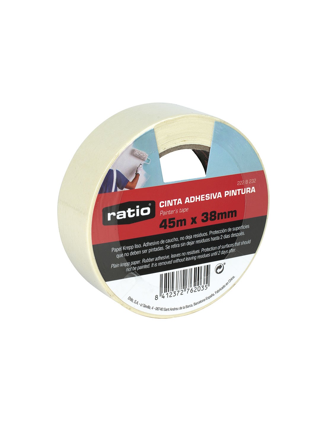 Cinta adhesiva de pintor RATIO. Soporte papel Krepp liso con adhesivo de caucho. Ideal para protección de superficies que no deben ser pintadas. Se retira sin dejar residuos hasta 2 días después de su aplicación. 45 m x 38 mm.