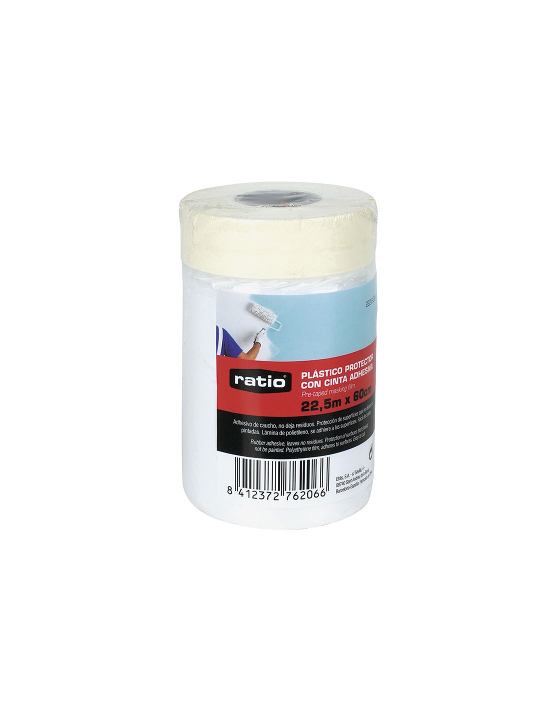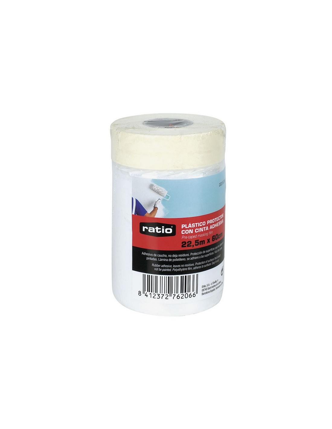 Cinta adhesiva de pintor RATIO con plástico protector Soporte papel Krepp liso con adhesivo de caucho. Ideal para protección de superficies que no deben ser pintadas. Lámina de polietileno que se adhiere a las superficies. Fácil de cortar. 22,5 m x 60 cm.