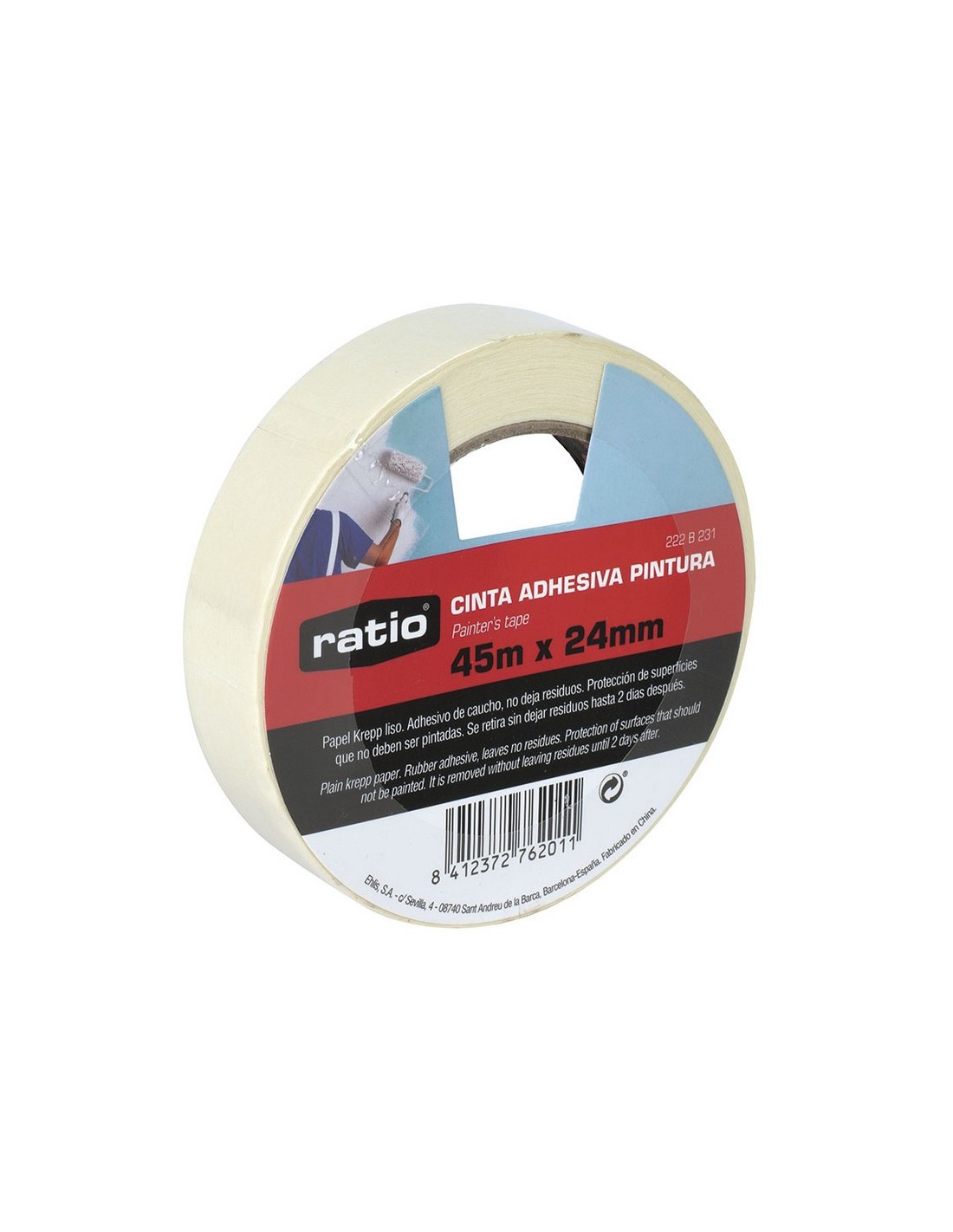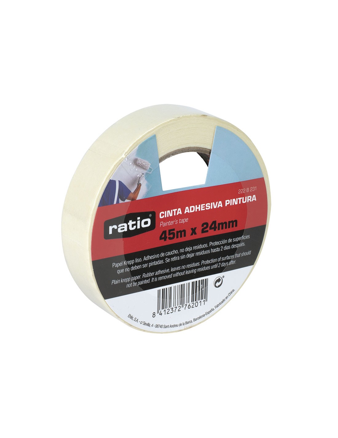 Cinta adhesiva de pintor RATIO. Soporte papel Krepp liso con adhesivo de caucho. Ideal para protección de superficies que no deben ser pintadas. Se retira sin dejar residuos hasta 2 días después de su aplicación. 45 m x 24 mm.