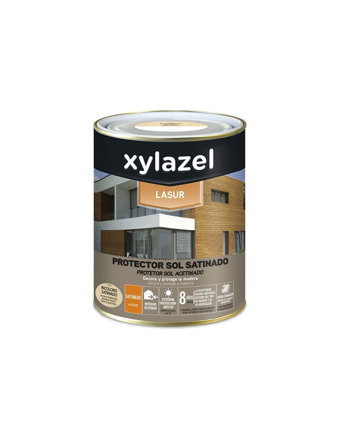 Barniz Lasur satinado XYLAZEL Cobertura 12 m²/L. Tiempo de secado tacto 1 hora. Repintado 3 h aprox. Capas 2. Protege la madera al exterior contra el sol, agua y hongos de azulado. Larga duración. 750 ml. Nogal.