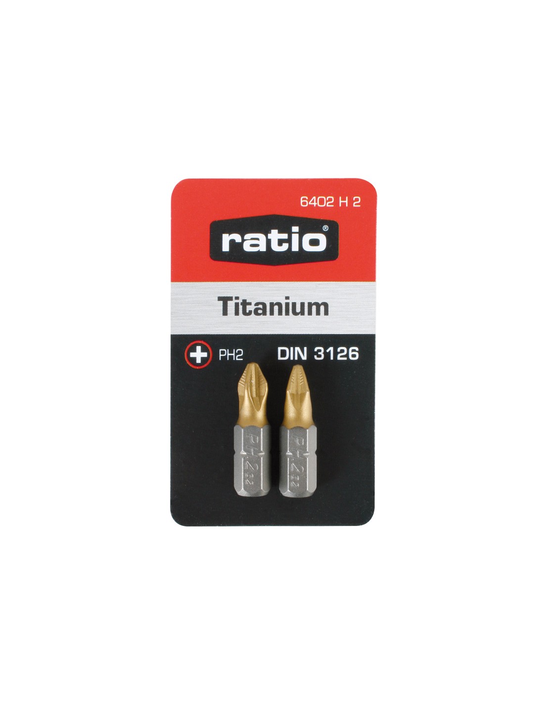 Puntas de atornillado RATIO Titanium. Acero cromo-vanadio S2 acabado Titanium. DIN 3126. Dureza 60 HRc. Hexágono 6,35 mm. Perfil estriado ACR. Blíster 2 puntas. Phillips Nº 2. 2 unidades.