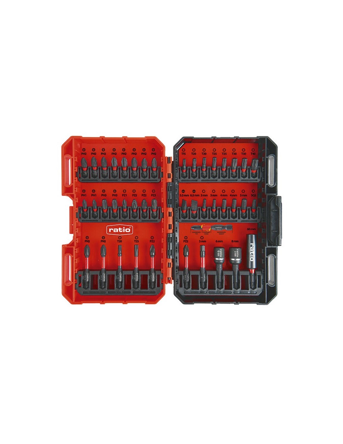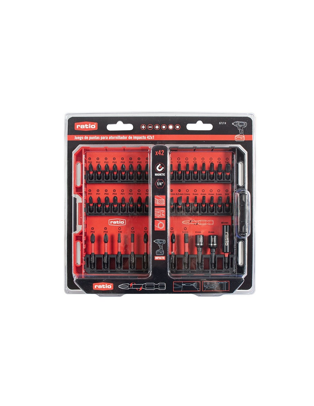 Puntas atornillado de impacto RATIO 6717 42 accesorios en estuche de plástico. Composición: 32 puntas de impacto de 25 mm: PH1x 2, PH2x8; PZ1, PZ2x2,PZ3; T15,T20x2,T25x2,T30x2,T40; Planas 5,5,6,5; H3x2,H4x2,H5; T#2.