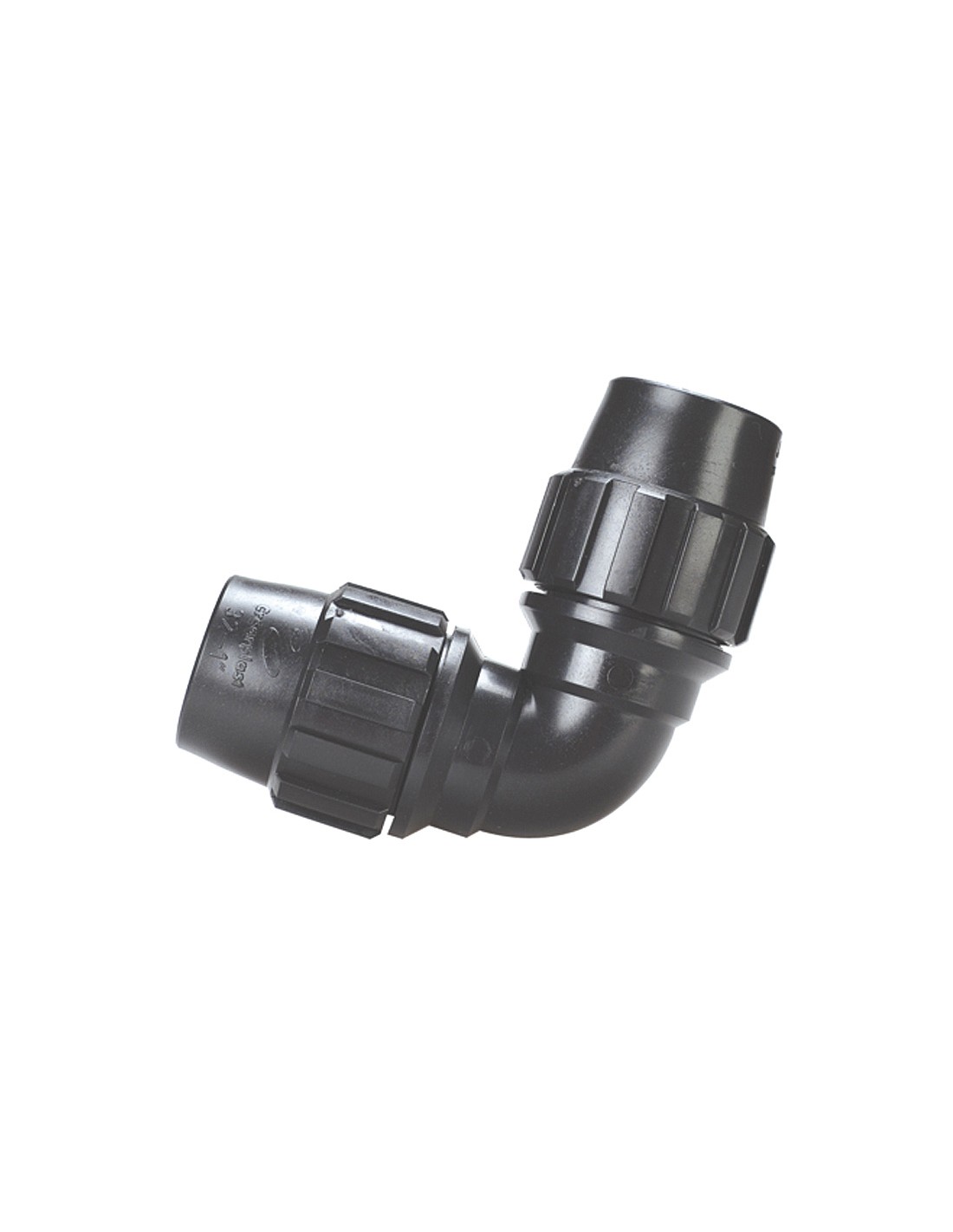 Fitting polietileno CREARPLAST. Accesorios de presión para tuberías PE. Etiquetado con código EAN individual. Según normas UNE-EN 712 y EN 715. Enlace codo 90º 25