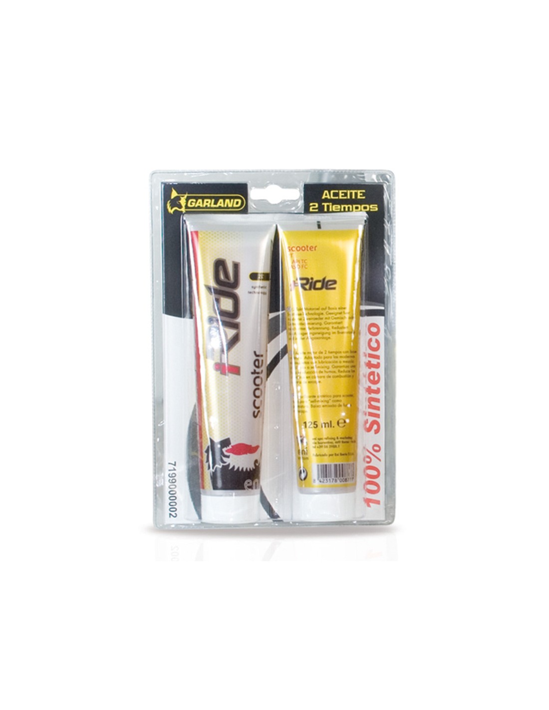 Aceite lubricante maquinaria de jardín GARLAND Sintético 100%. Motor gasolina 2 tiempos. 2 tubos. 125+125 ml.