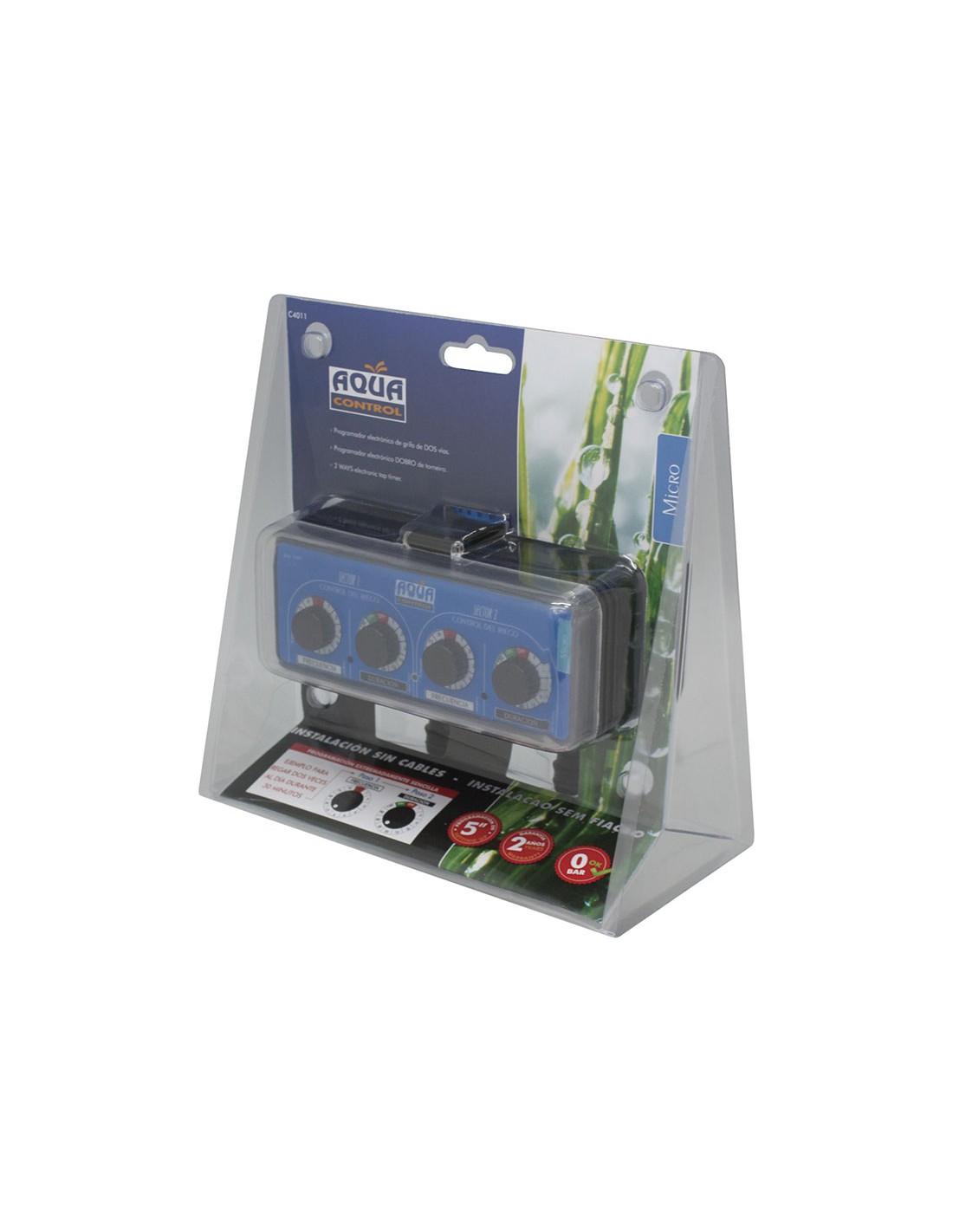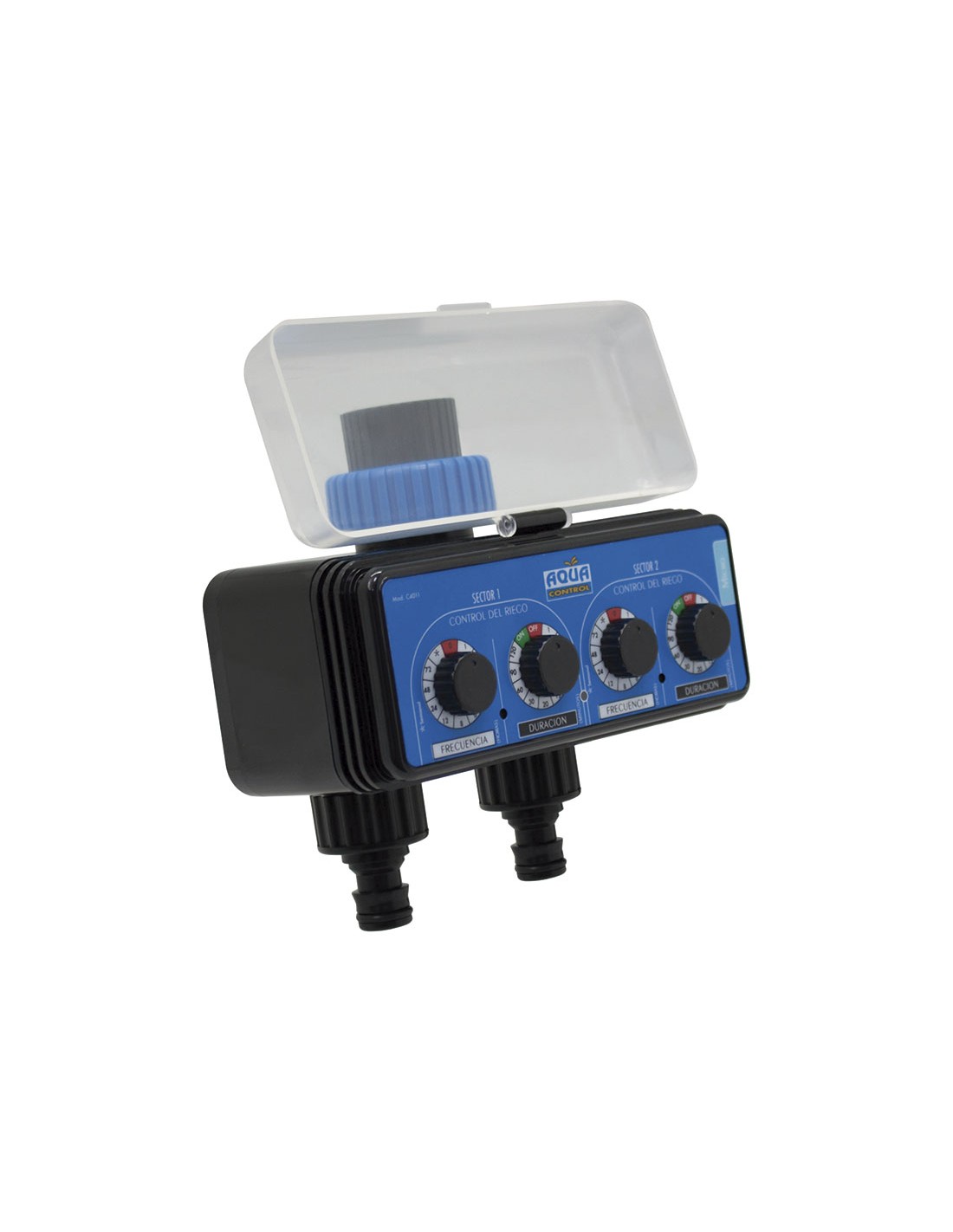 Programador analógico de bola de doble salida AQUA CONTROL Frecuencia de riego: de 1 a 72 h o una vez a la semana. Duración del riego: de 1 a 120 min. Función \"Delay\" (retraso riego).