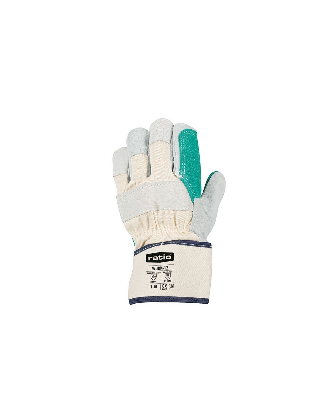 Guante serraje RATIO Work-12 Piel serraje con refuerzo extra en palma y pulgar. Buena protección a cortes y abrasión. Forrado en la palma. Uso: manipulación de chapa, ferrallas, siderurgia, automoción. Cat. II EN 407, EN 388. Talla 9.