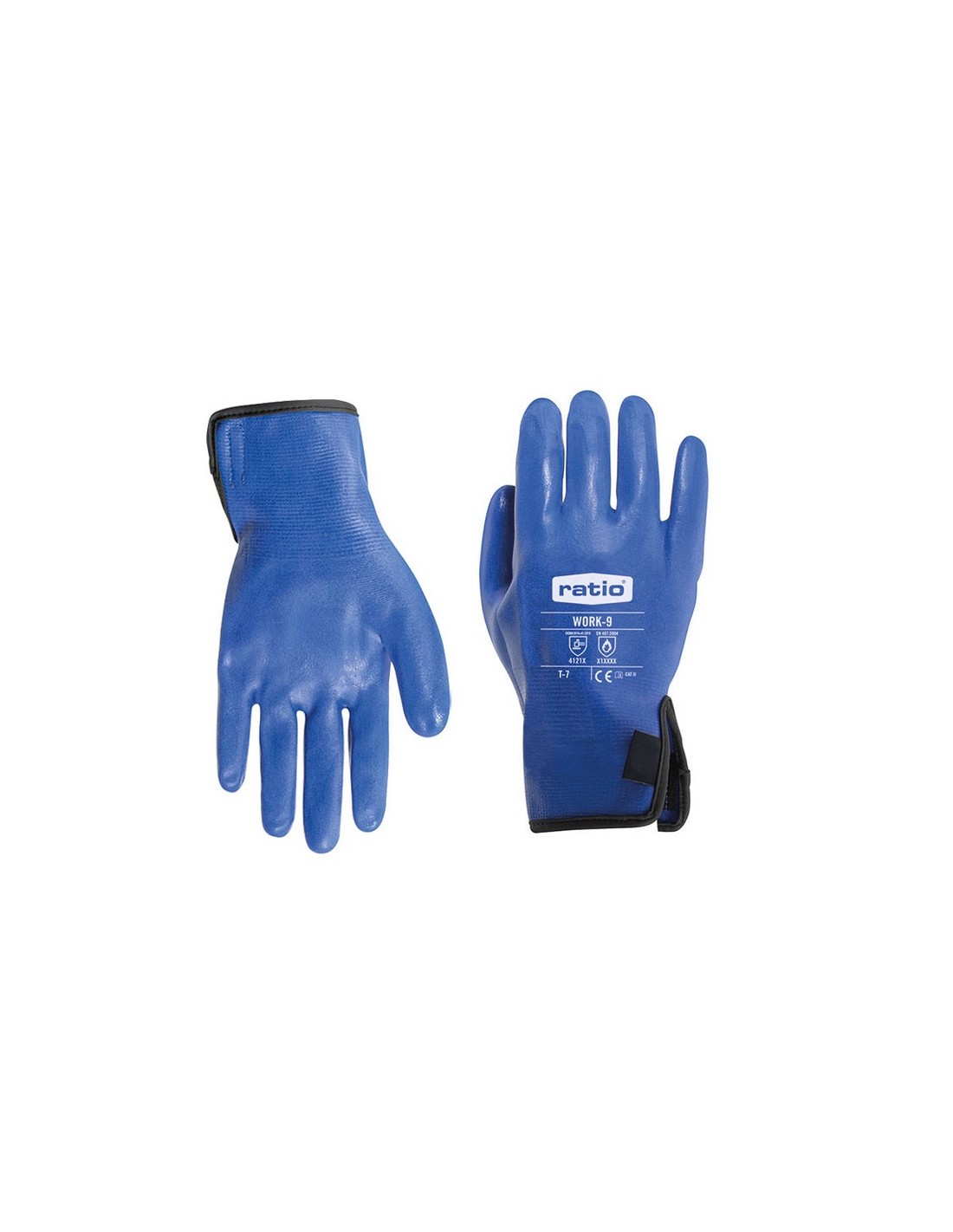 Guante RATIO Work-9 Soporte de nilón sin costuras recubierto de nitrilo foam azul. Tipo conductor. Máxima resistencia a abrasión. Perfecto ajuste a la mano. Puño elástico con banda de ajuste. Usos: control de calidad en procesos, conductores de vehículos, trabajos sin riesgos de corte. EN420:2003 + AI:2009 EN388:2016 CE EN407:2004 CAT.II. Talla 9.