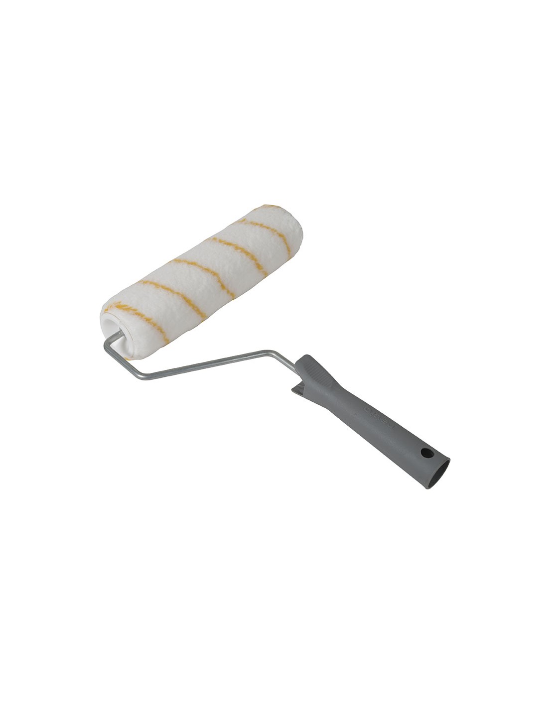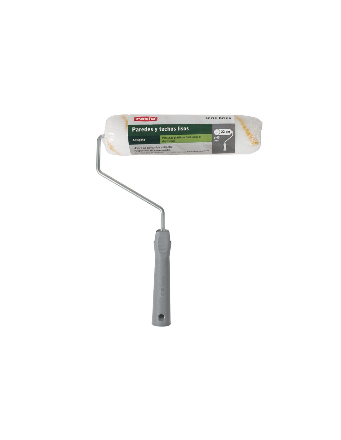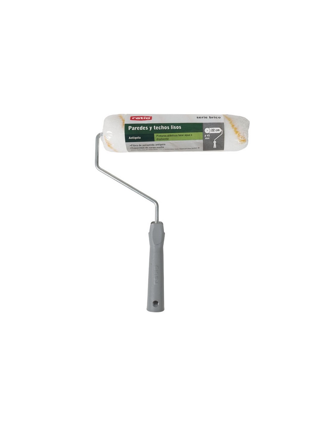 Rodillo antigota RATIO serio Brico. 100% poliamida. Empuñadura ergonómica en polipropileno. Varilla acero ø 6 mm. Ideal para paredes y techos liso. Interior/exterior. Recomendado para pinturas plásticas. Rodillo 22 cm. Cono 45 mm.