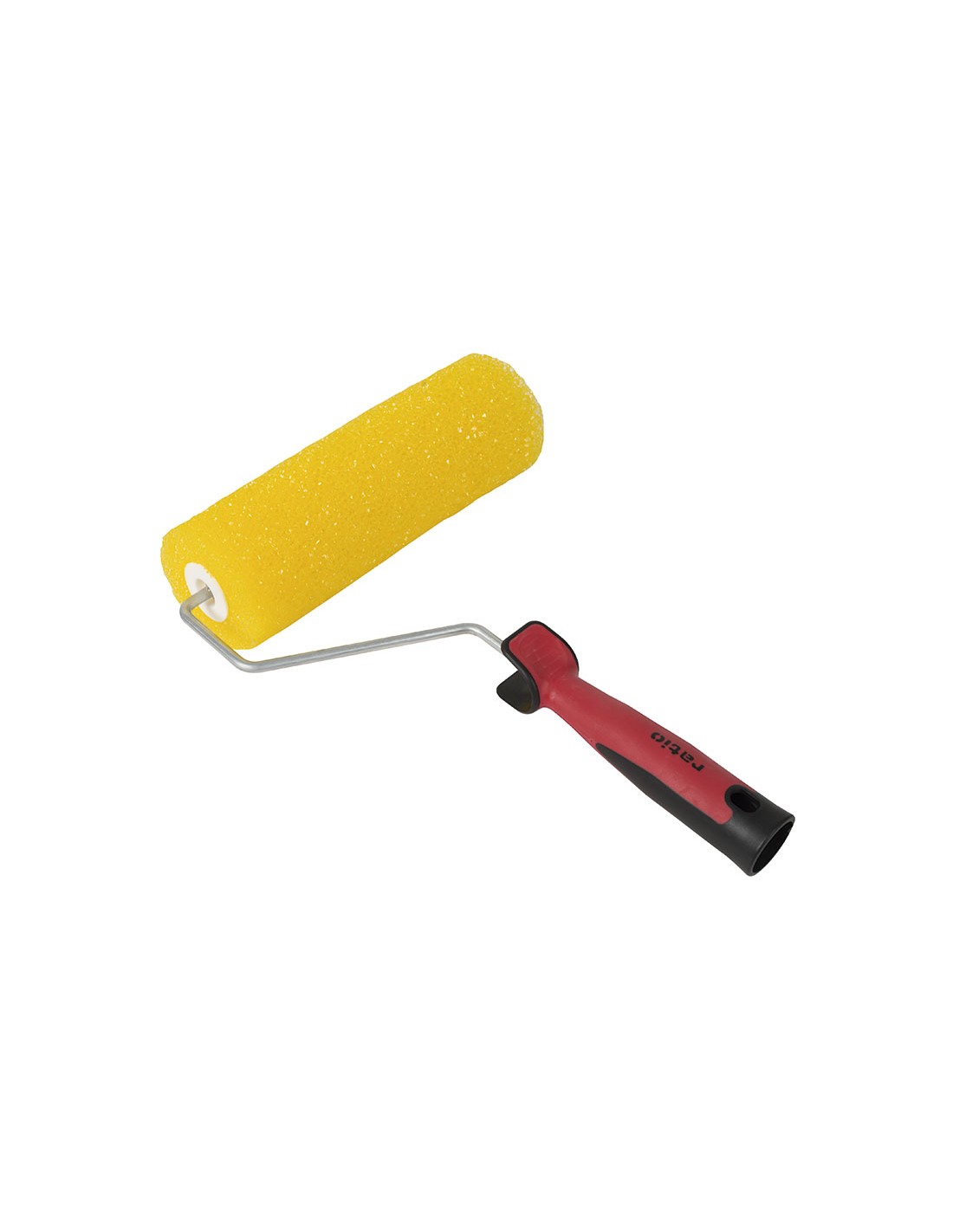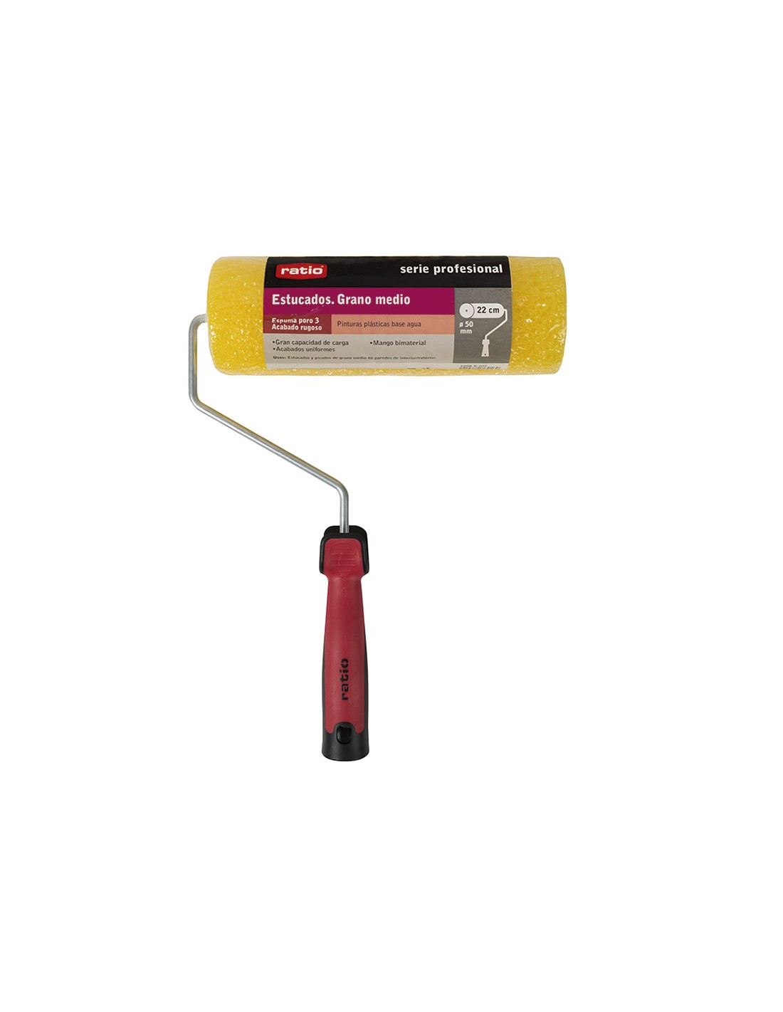 Rodillo espuma RATIO serie Profesional. Espuma poliuretano poro 3, base poliéster. Empuñadura ergonómica bimaterial rojo y negro. Varilla acero ø 6 mm. Ideal para picados y estucados de grano medio. Recomendado para pinturas base agua. Gran capacidad de carga. Cono 50 mm. Rodillo 22 cm.
