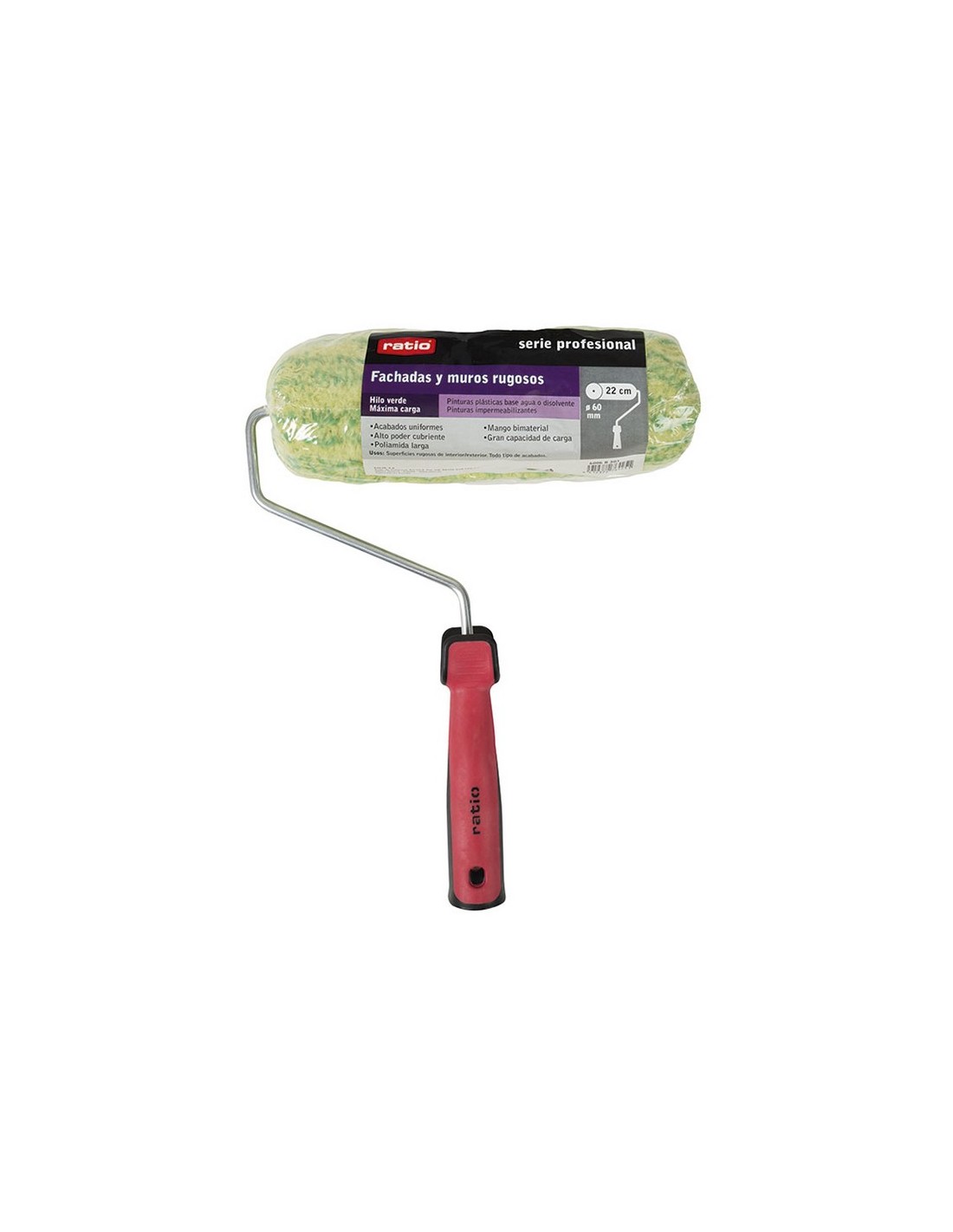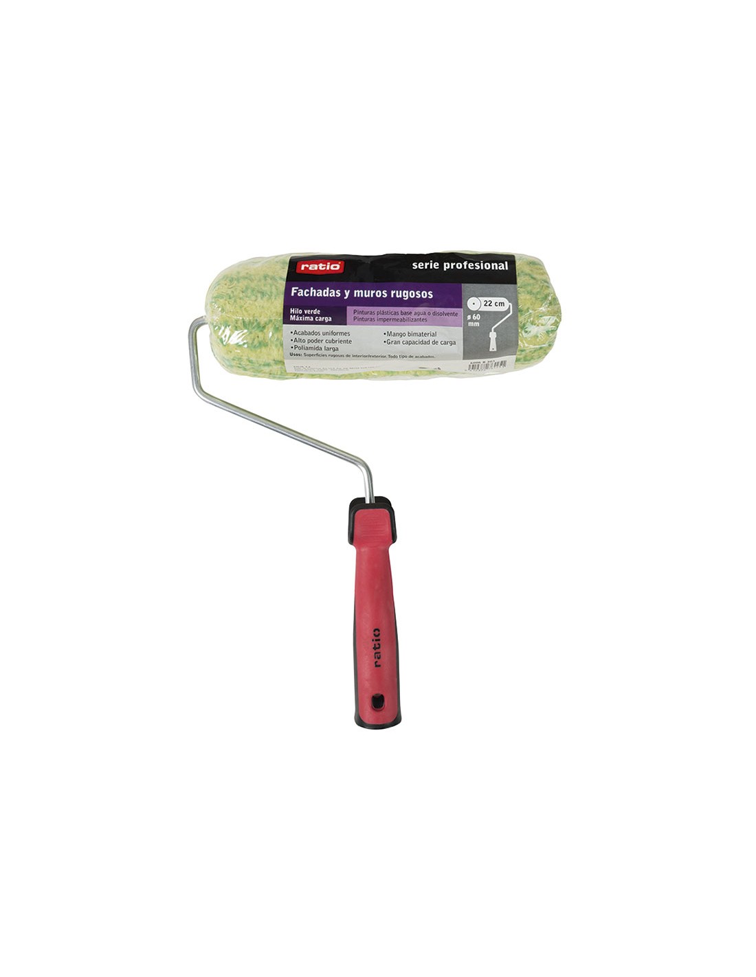 Rodillo fachadas y muros rugosos RATIO serie Profesional 100% poliamida larga. Empuñadura ergonómica bimaterial rojo y negro. Varilla acero ø 6 mm. Recomendado para pinturas base agua. Alto poder cubriente. Gran capacidad de carga. Rodillo 22 cm. Cono 60 mm.