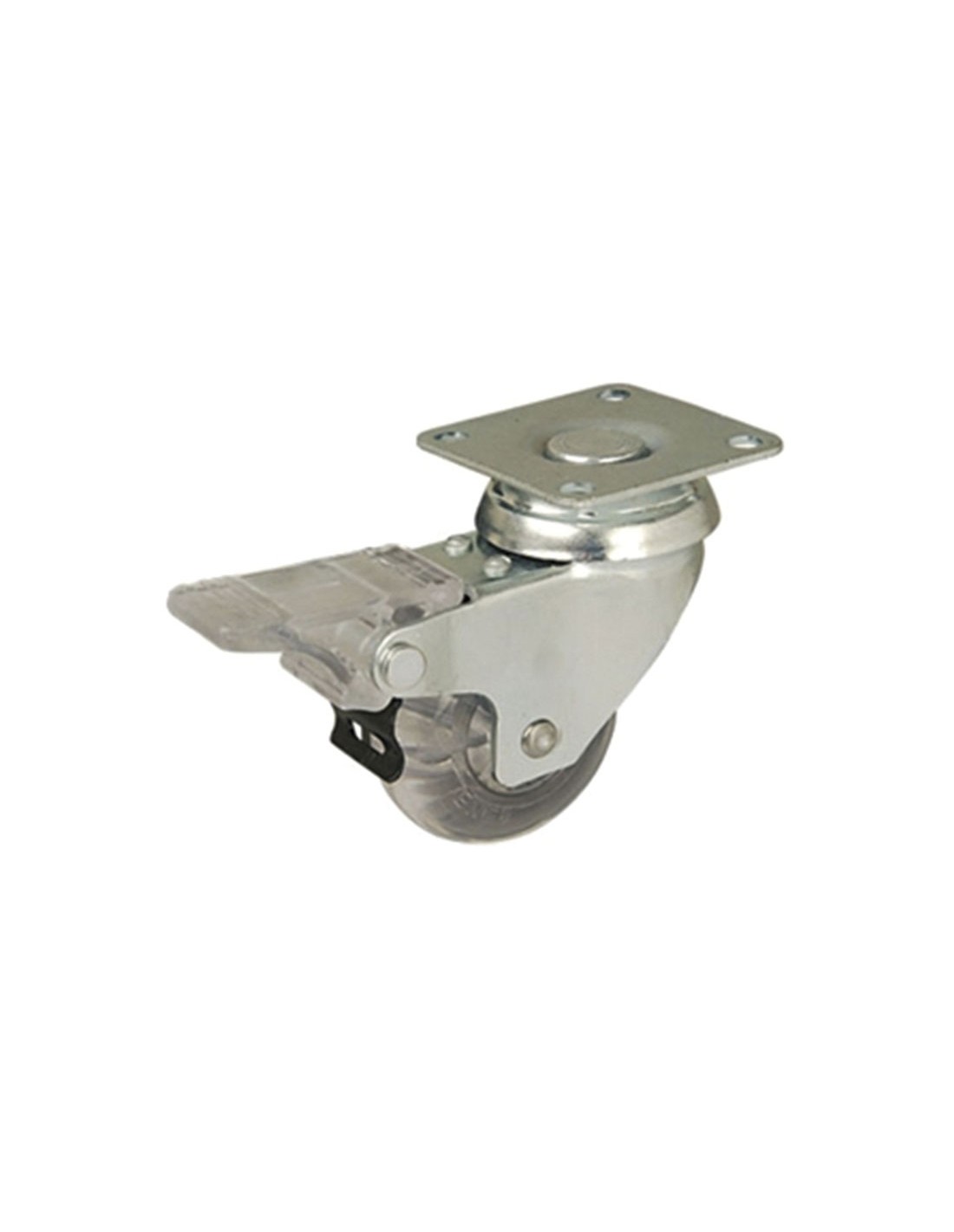 Rueda doméstica AFO serie Cliper. Rueda giratoria de acero estampado de 2 mm de espesor con acoplamiento por medido de pletina. Base de sujeción horizontal. Doble hilera axial de bolas de acero en el rodamiento. Acabado cincado blanco brillante. Aro de poliuretano traslucido. Disposi ø 50x20 mm. Pletina con freno. 40 kg.