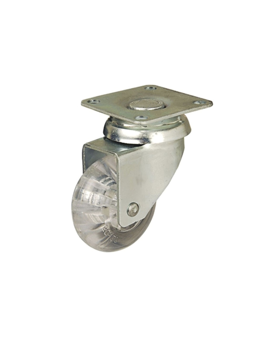 Rueda doméstica AFO serie Cliper. Rueda giratoria de acero estampado de 2 mm de espesor con acoplamiento por medido de pletina. Base de sujeción horizontal. Doble hilera axial de bolas de acero en el rodamiento. Acabado cincado blanco brillante. Aro de poliuretano traslucido. Disposi ø 50x20 mm. Pletina sin freno. 40 kg.