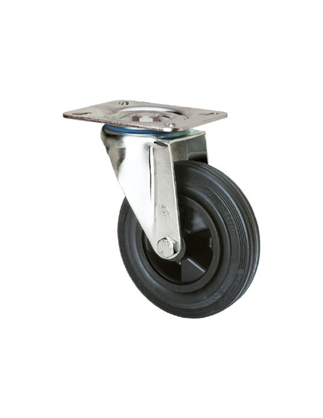 Rueda semi-industrial ALEX serie ZV-PS. Núcleo de poliamix y banda de goma. Soporte embutido con doble hilera de bolas. Acabado cincado brillante. Rueda suave y silenciosa. Máxima protección de los suelos. Absorción de golpes y vibraciones. Cojinete liso. Norma EN 12530/12532. ø 125 mm. Pletina giratoria sin freno.