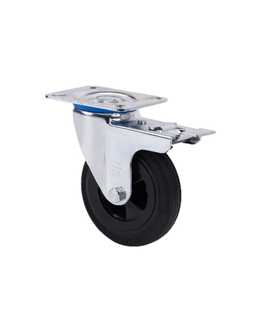 Rueda semi-industrial ALEX serie ZV-PS. Núcleo de poliamix y banda de goma. Soporte embutido con doble hilera de bolas. Acabado cincado brillante. Rueda suave y silenciosa. Máxima protección de los suelos. Absorción de golpes y vibraciones. Cojinete liso. Norma EN 12530/12532. ø 80 mm. Pletina giratoria con freno.