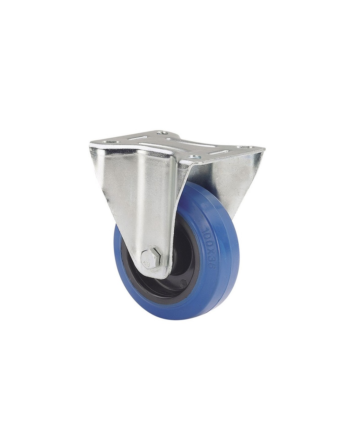 Rueda semi-industrial fija ALEX Serie 121-121 Rueda de goma azul elástica. Tipo soporte giratorio. Tipo fijación platina. Cojinete de rodillos. No mancha el suelo. Gran absorción golpes vibraciones. Ruedas suaves silenciosas. Modelo TW0294. Sin freno.
