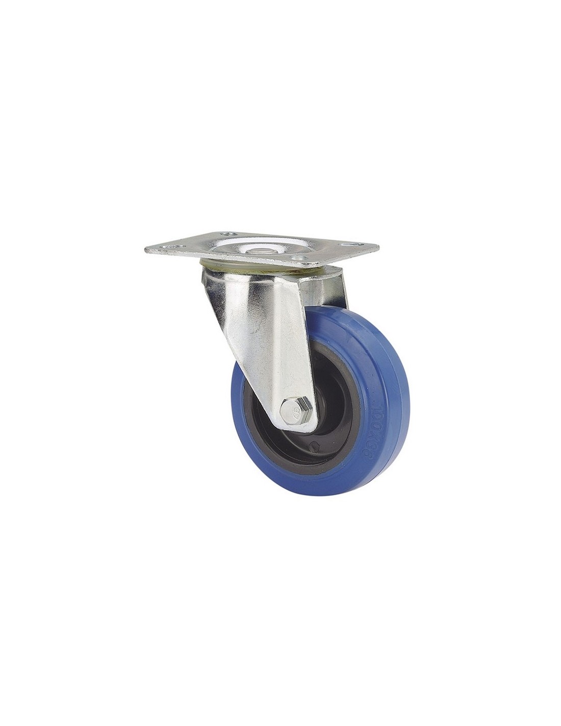 Rueda semi-industrial ALEX Serie 121-121 Rueda goma elástica azul. Tipo soporte giratorio. Tipo fijación platina. Cojinete de rodillos. No mancha el suelo. Gran absorción golpes vibraciones. Modelo TW0039. Sin freno.