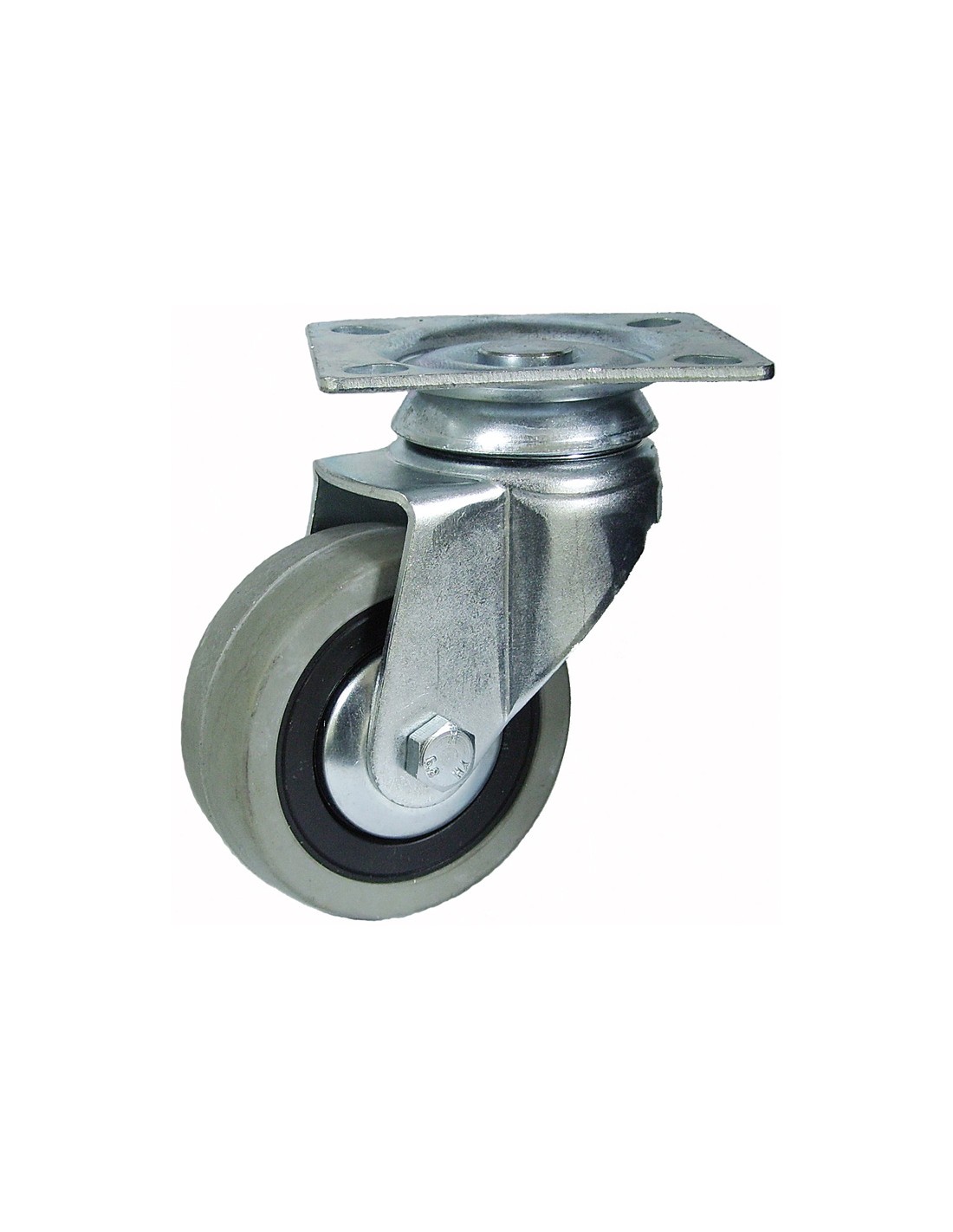 Rueda semi-industrial AFO serie Capitol GG. Aro con bandaje de goma gris inyectado sobre núcleo de nilón (poliamida) color negro. Buje con taladro liso. ø 60 mm. Pletina. 85 kg.