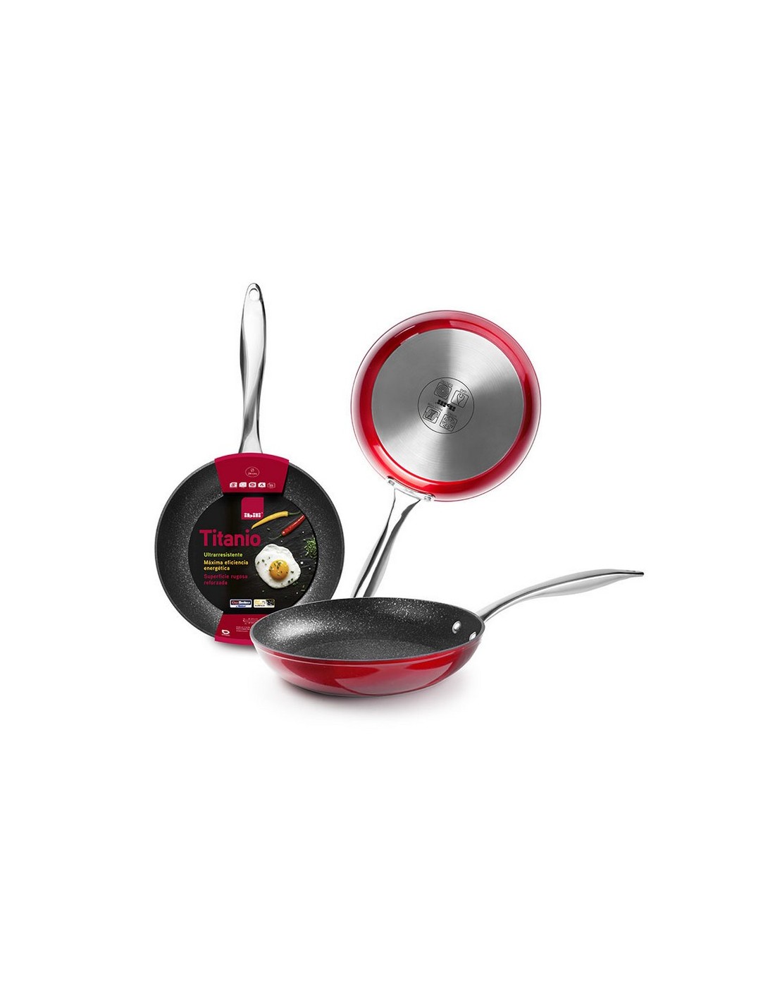 Sartén aluminio IBILI Red Rock Aluminio forjado. Superficie rugosa reforzada por impacto de bolas de acero, estilo piedra. Antiadherente Quantanium 3 capas, libre PFOA. Mango metálico remachado. Base Full induction. Para todo tipo de cocinas. ø 18 cm.