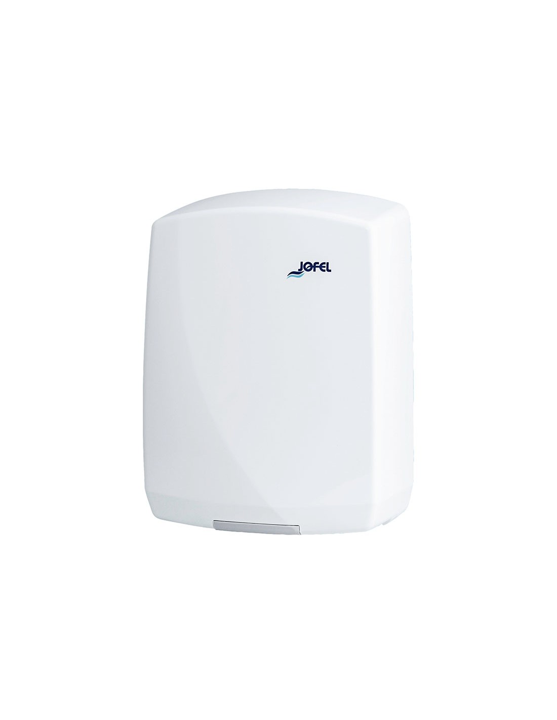 Secamanos óptico JOFEL Futura. ABS blanco. Puesta en marcha y parada automática por aproximación de las manos. No necesita toma de tierra (clase II). Puede instalarse a 60 cm del punto de agua. Doble aislamiento eléctrico. Alta eficiencia. Sistema de seguridad con limitador de tie 1.960 W.