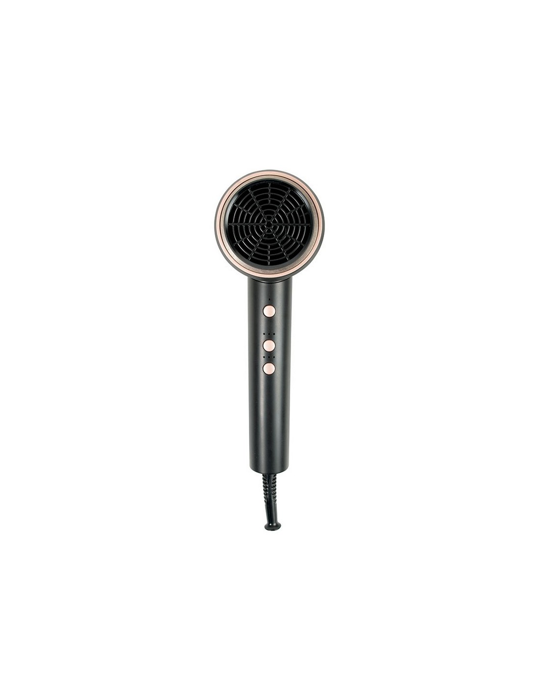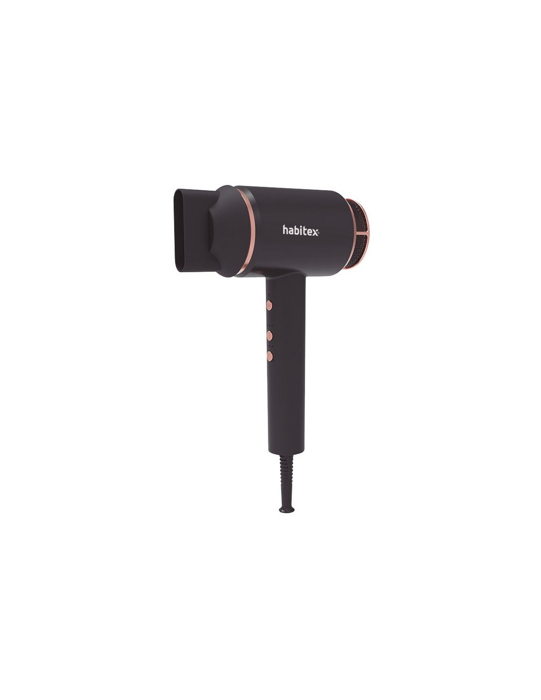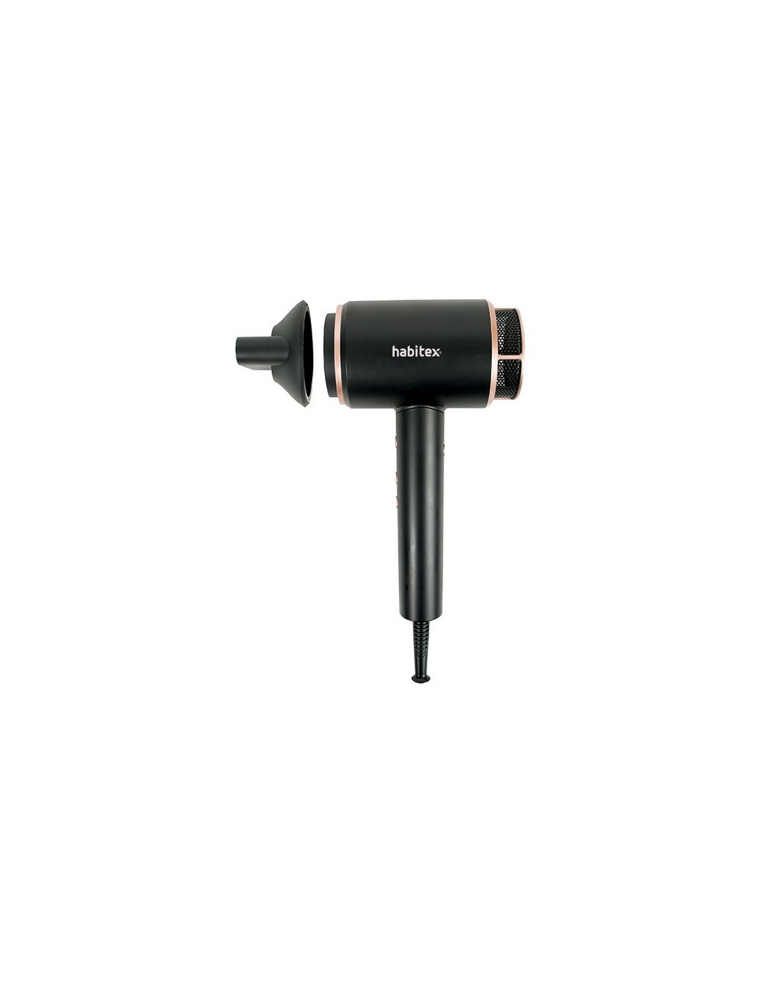Secador de cabello HABITEX CP8441 Motor DC Ionic Technology. Diseño compacto. Botón de encendido y apagado. Botón luz led para 3 temperaturas y botón para 3 velocidades. Golpe de aire frío. Filtro extraíble. Concentrador. Negro mate + Rose gold. 1.600-2.000 W.