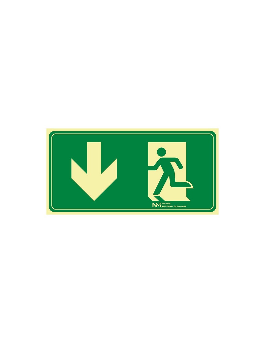 Señales de evacuación NMZ Fabricadas en PVC luminiscente. Grosor 0,7-1 mm según modelo, Clase A (1 mm) o. Clase B (0,7 mm). Distancia de visión 10 m. EVACUACIÓN FLECHA ABAJO.