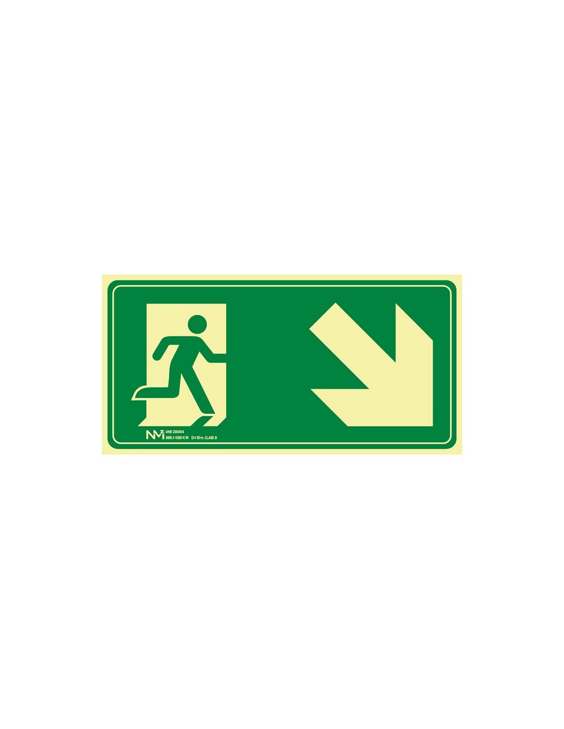 Señales de evacuación NMZ Fabricadas en PVC luminiscente. Grosor 0,7-1 mm según modelo, Clase A (1 mm) o. Clase B (0,7 mm). Distancia de visión 10 m. EVACUACIÓN ESCALERA ABAJO Dcha.