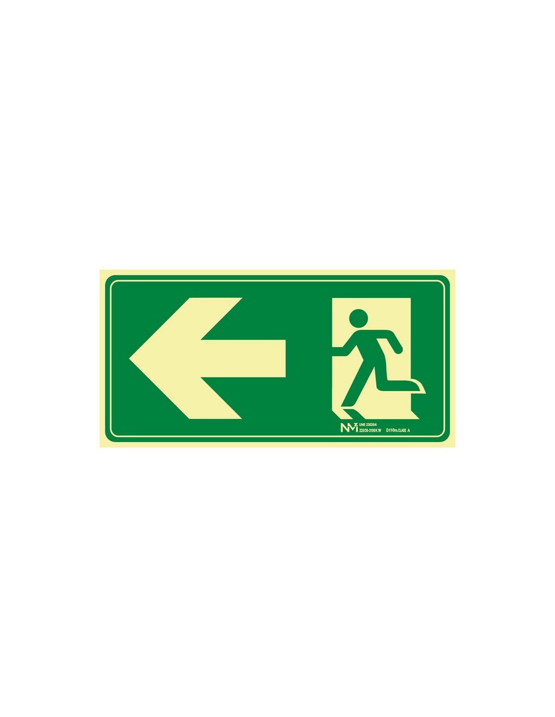 Señales de evacuación NMZ Fabricadas en PVC luminiscente. Grosor 0,7-1 mm según modelo, Clase A (1 mm) o. Clase B (0,7 mm). Distancia de visión 10 m. EVACUACIÓN FLECHA IZQUIERDA.