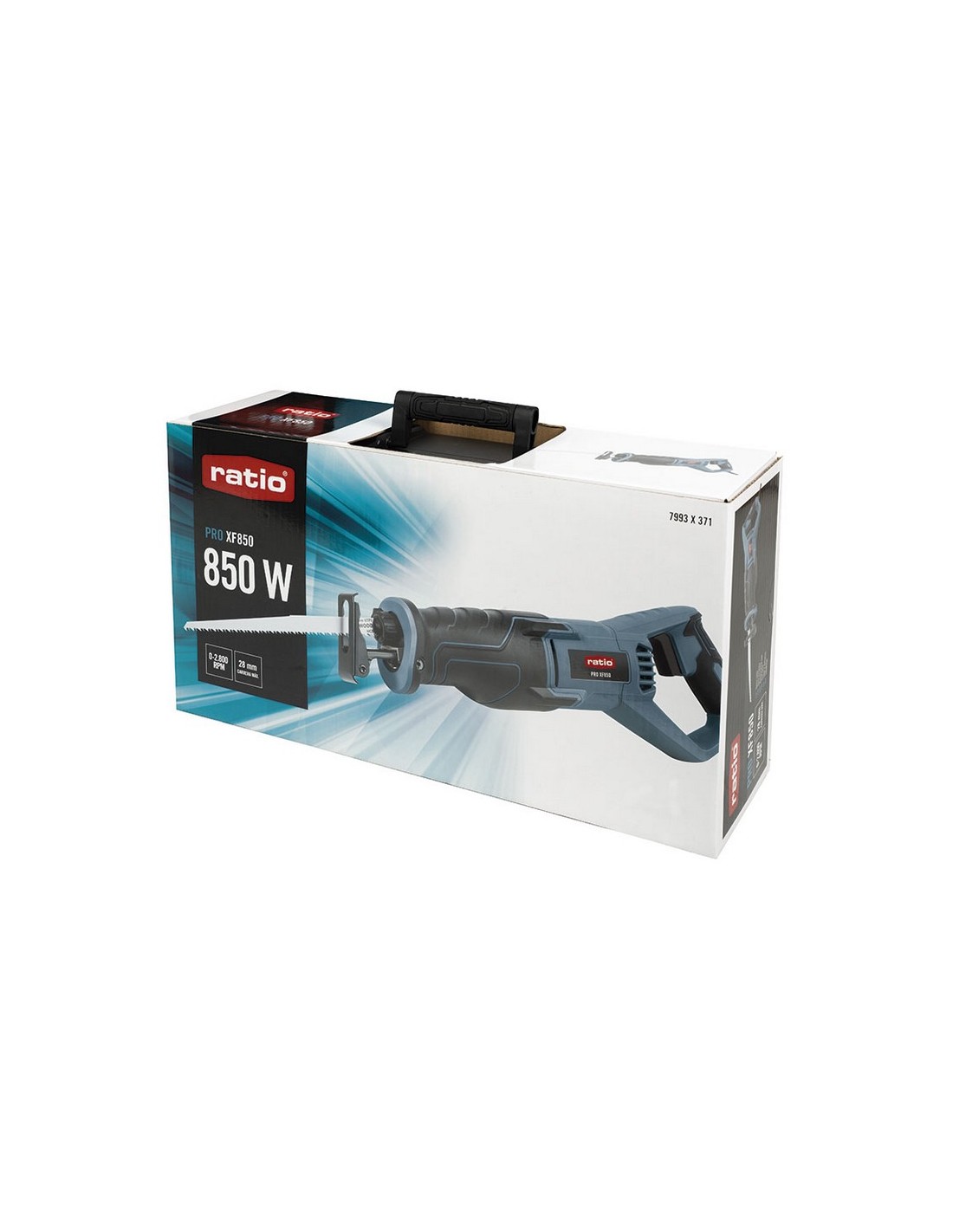 Sierra de sable RATIO PRO XF850 Profesional. Caja engranajes en aleación de aluminio. Velocidad variable. Sistema de cambio de hoja sin herramientas. Empuñadura ergonómica antideslizante. Maletín de transporte con 3 hojas de corte. Potencia: 850 W.