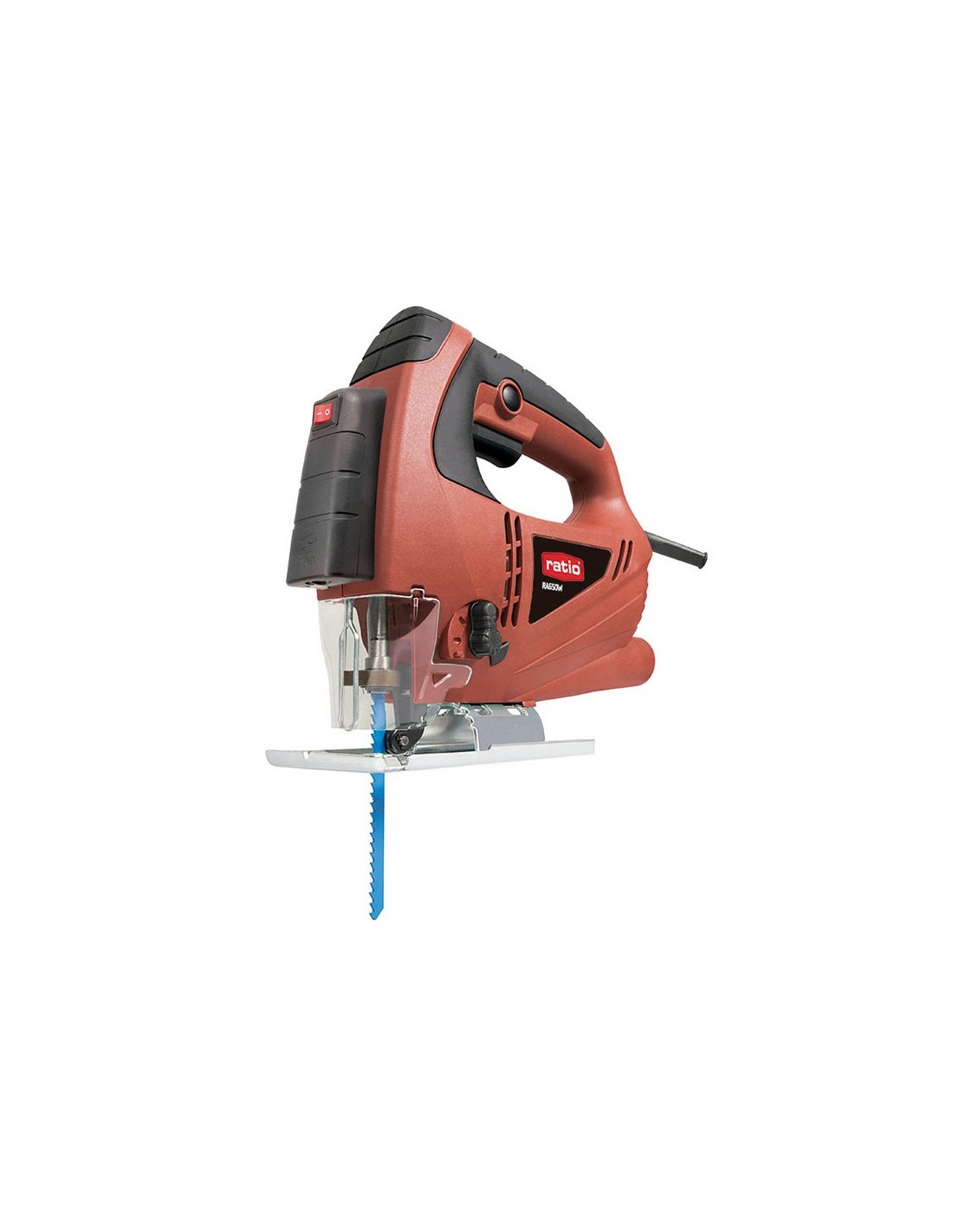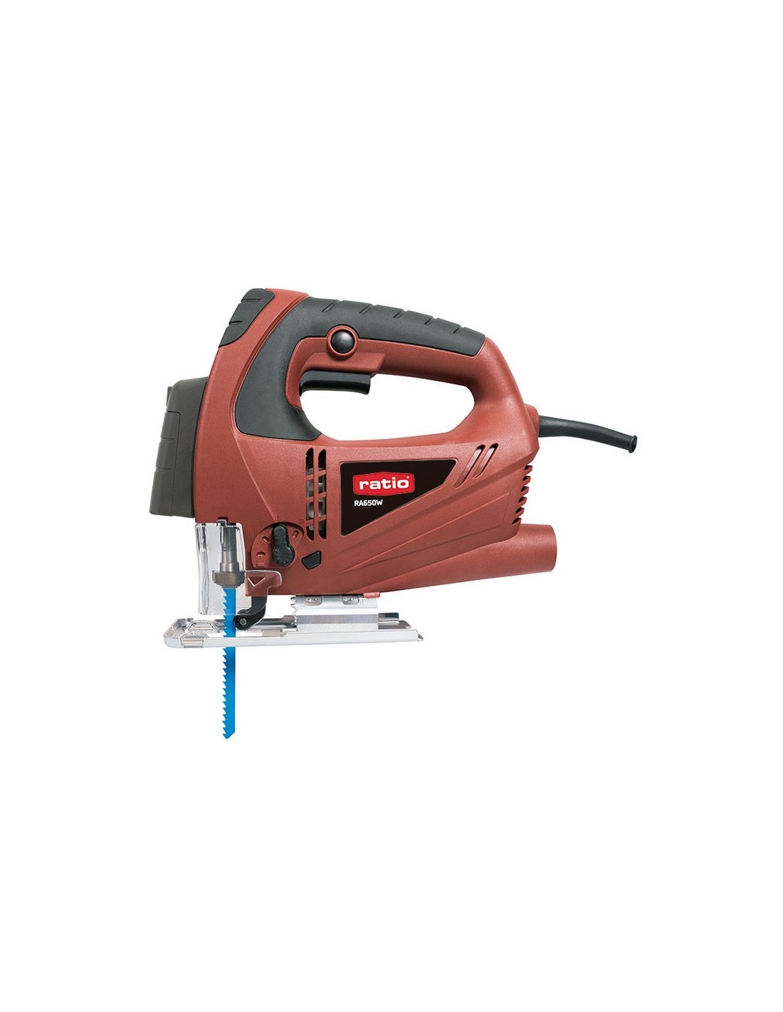 Sierra caladora RATIO RA650W Variador electrónico con 6 niveles de velocidad. Ajuste de corte pendular 4 posiciones. Empuñadura bimaterial. Sistema de cambio rápido de hoja. Guía láser. Incluye 1 hoja corte madera, racor de aspiración, guía lateral y llave de servicio. Maletín de transporte. Potencia: 650 W.