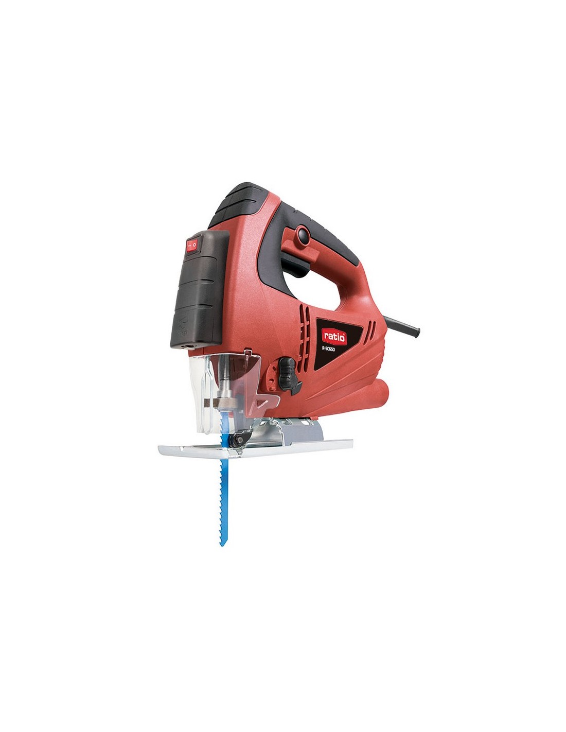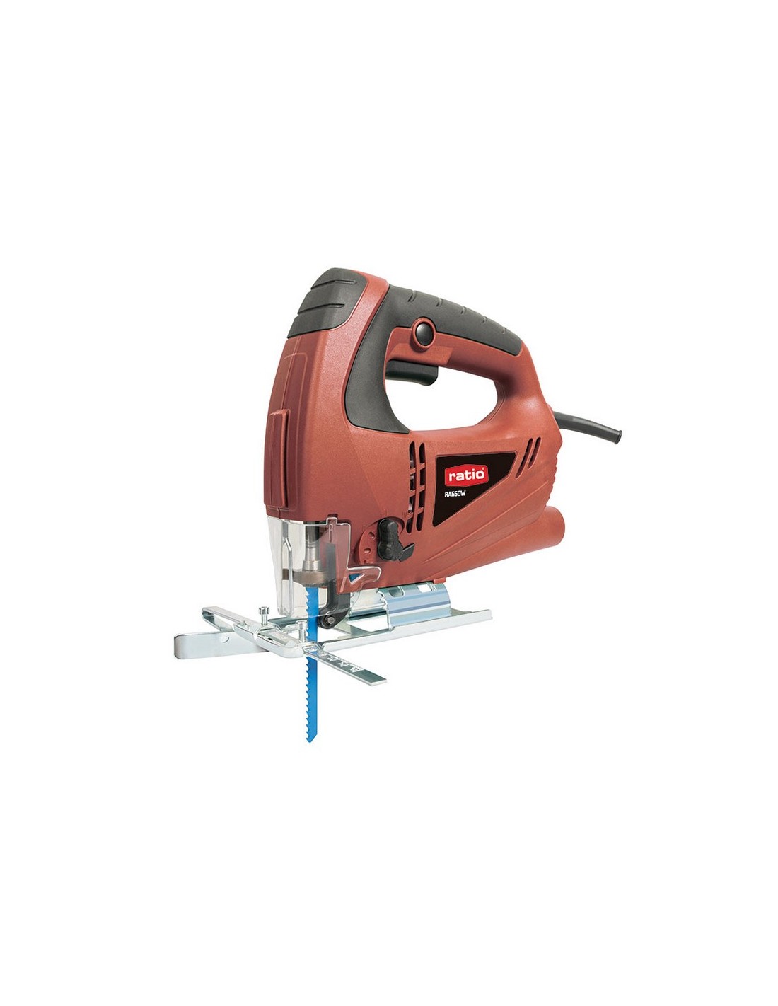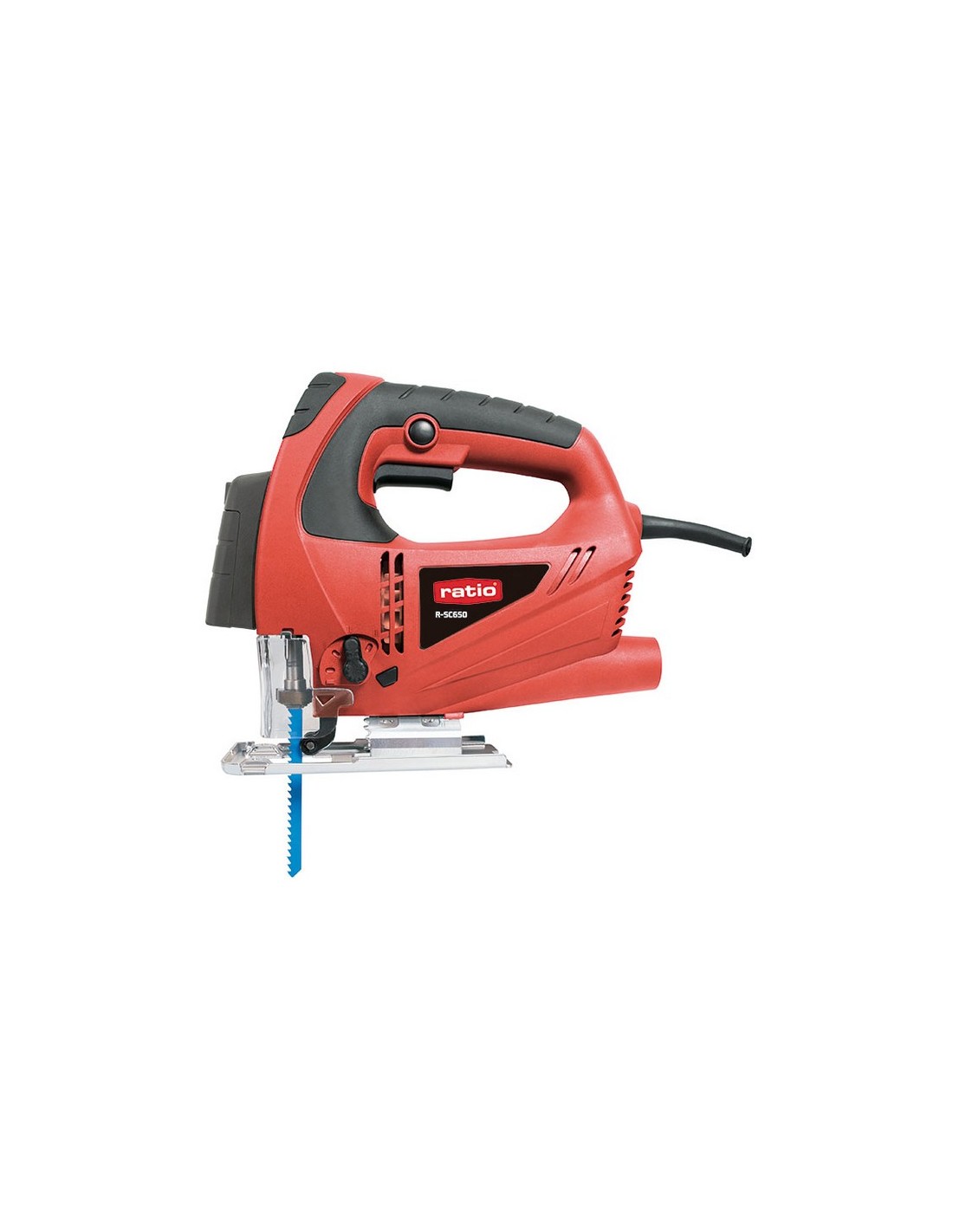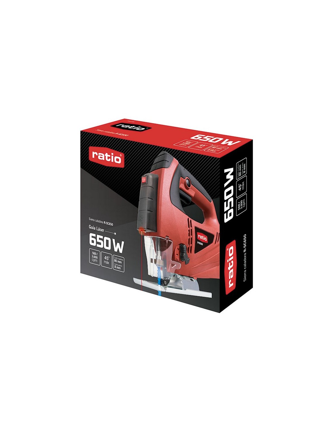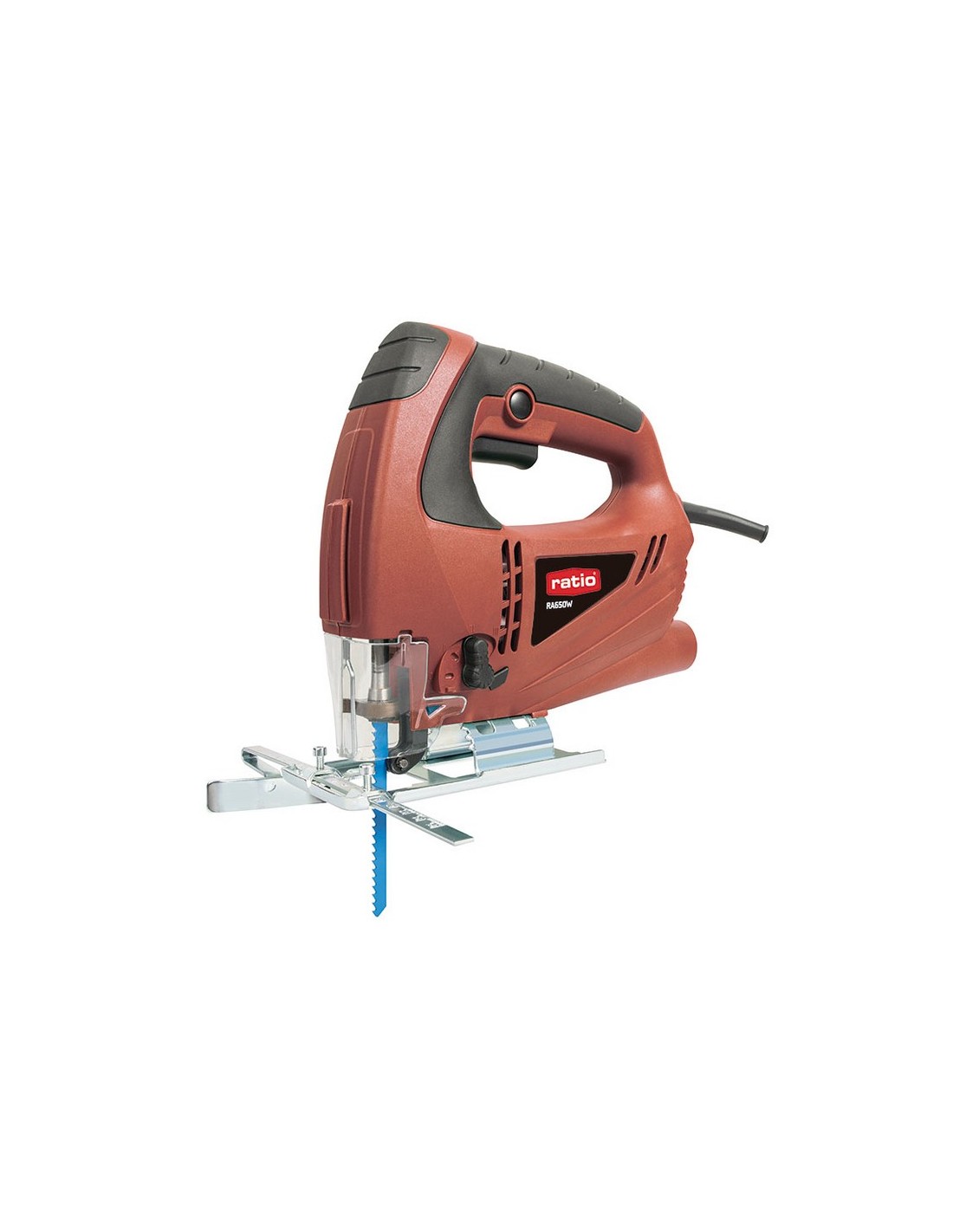 Sierra caladora RATIO R-SC650 Regulación electrónica de 6 velocidades. Pendular 4 posiciones. Cambio rápido de cuchilla con inserción T (tipo Bosch). Guía laser. Empuñadura bimaterial. Incluye 1 hoja corte madera, racor de aspiración, guía lateral y llave de servicio. Potencia: 650 W.
