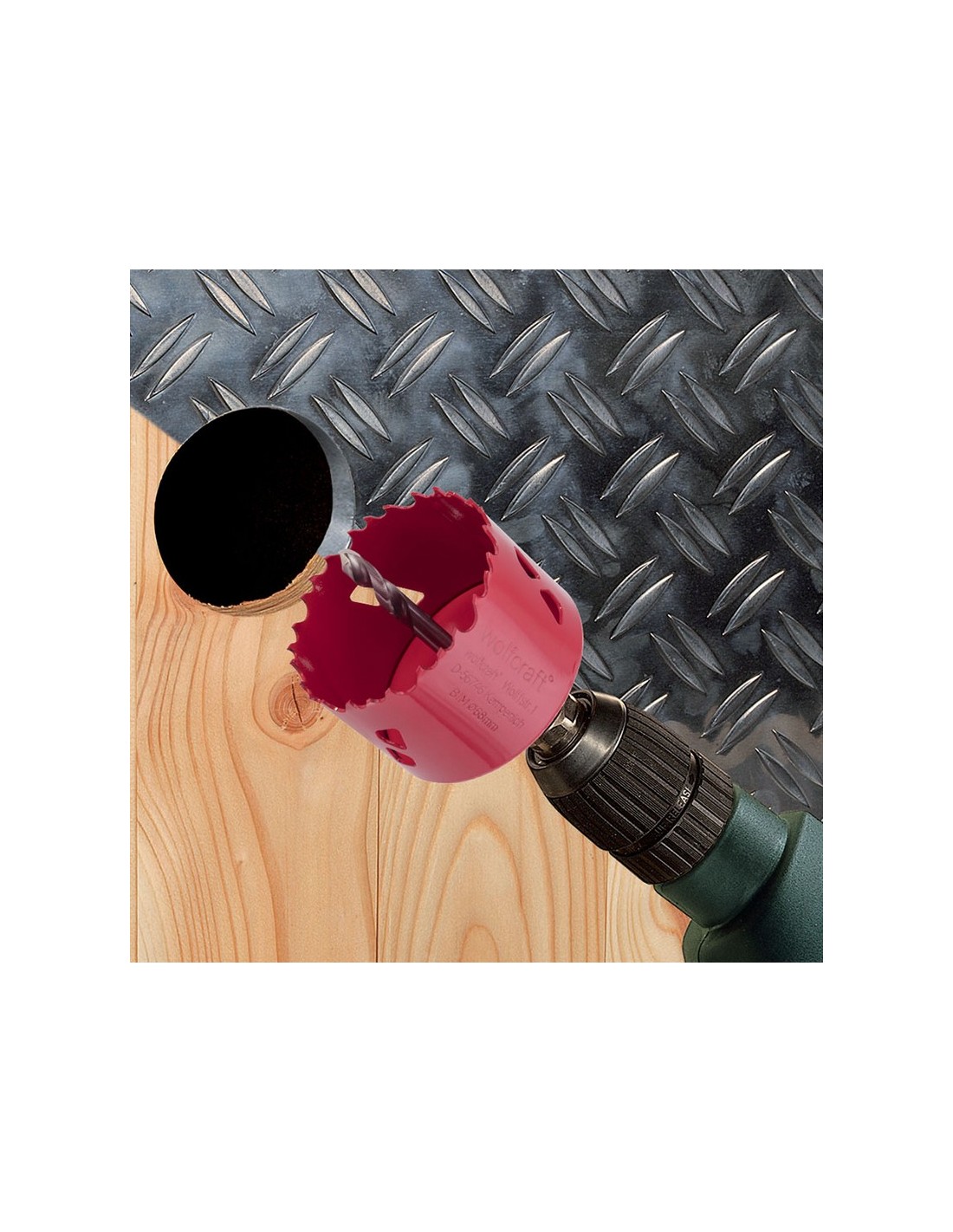Sierra corona bimetal WOLFCRAFT Para el uso en madera, metal, plástico, placas para construcción en seco y de aislante (por ejemplo, placas de yeso y de OSB). Modelo con vástago hexagonal de 9,5 mm de diámetro y broca de centrado de 6 mm de diámetro, se puede emplear directamente. ø 74 mm.