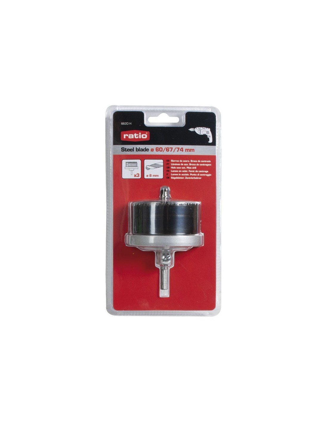 Sierra corona múltiple RATIO 6620 Hojas intercambiables. Para corte de madera, yeso, plástico. 7 hojas ø 25, 32, 37, 43, 50, 56, 63 mm. Vástago 8 mm.