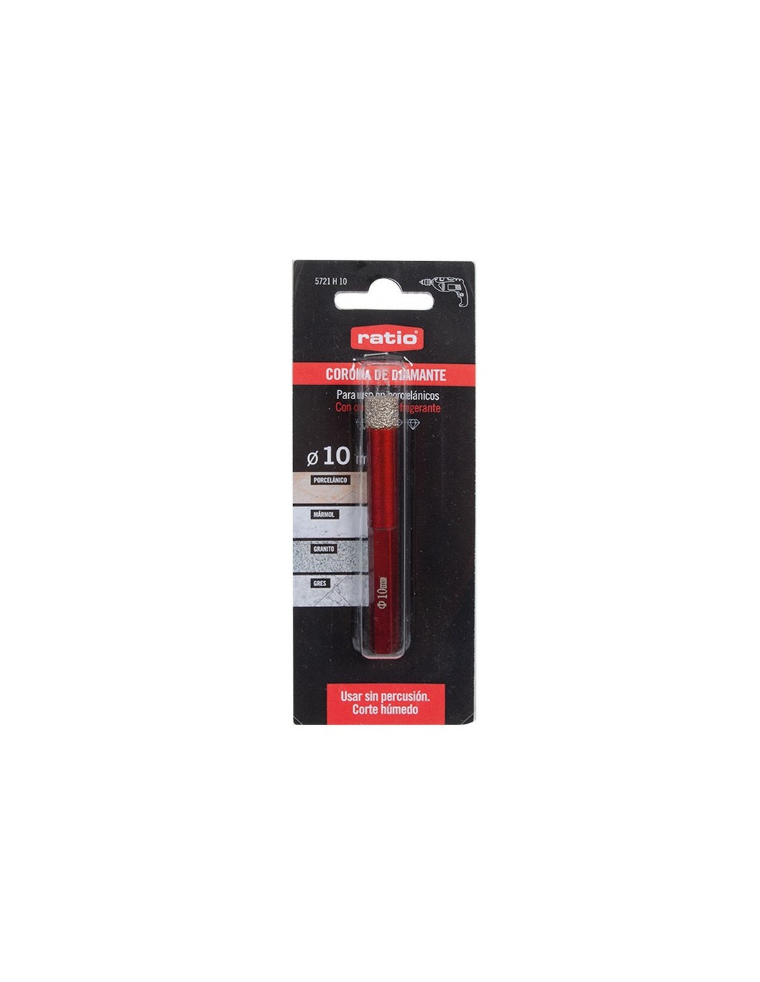Sierra corona diamante para porcelánico RATIO Corona excelente para corte en seco y con taladro. Para trabajos en seco y sin percusión, husillo hexagonal 8 mm, En su interior contiene una cera refrigerante para obtener un mayor número de agujeros (Nota: si se acaba antes la cera que el diamante, se puede seguir usando perfectamente con agua). Para; porcelánico, mármol, cerámica, gres duro y granito fino. Profundidad máxima: 30 mm. ø 10 mm.