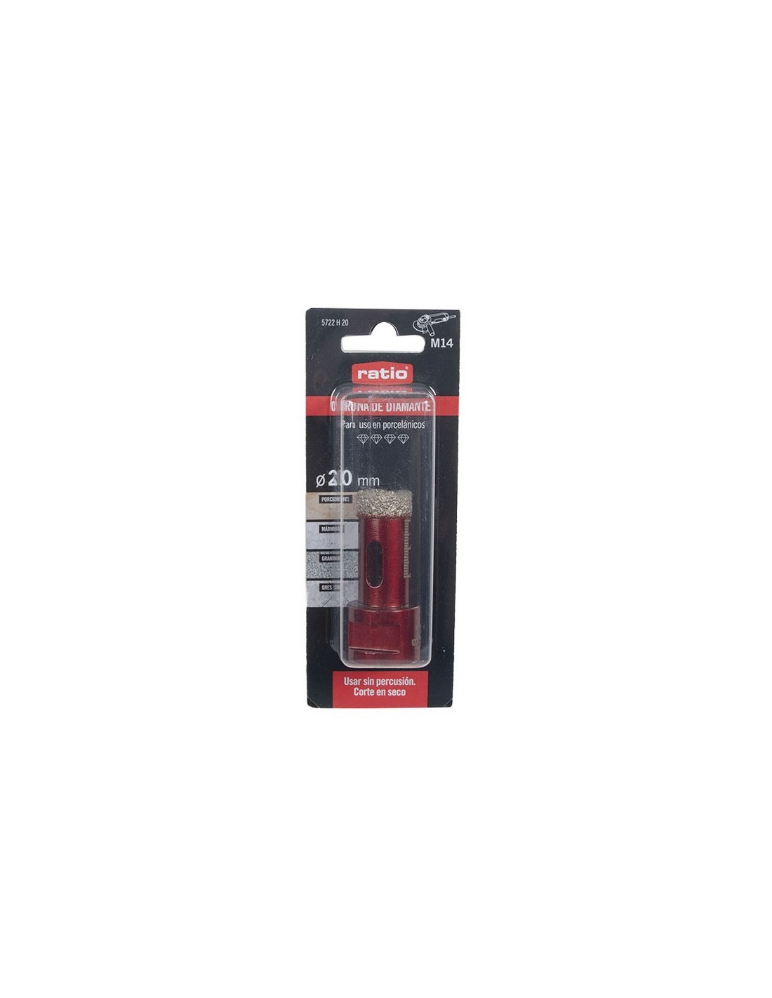 Sierra corona diamante para porcelánico RATIO Corte de materiales duros, incluso Dekton, porcelánico y gres. Trabajos en seco y sin percusión. Rosca M-14. Corona milimetrada. ø 6, 8 y 10 mm incorporan en su interior una cera refrigerante para obtener mayor número de agujeros. (Si se acaba antes la cera que el diamante, se puede seguir usando refrigerando con agua). ø 20 mm.