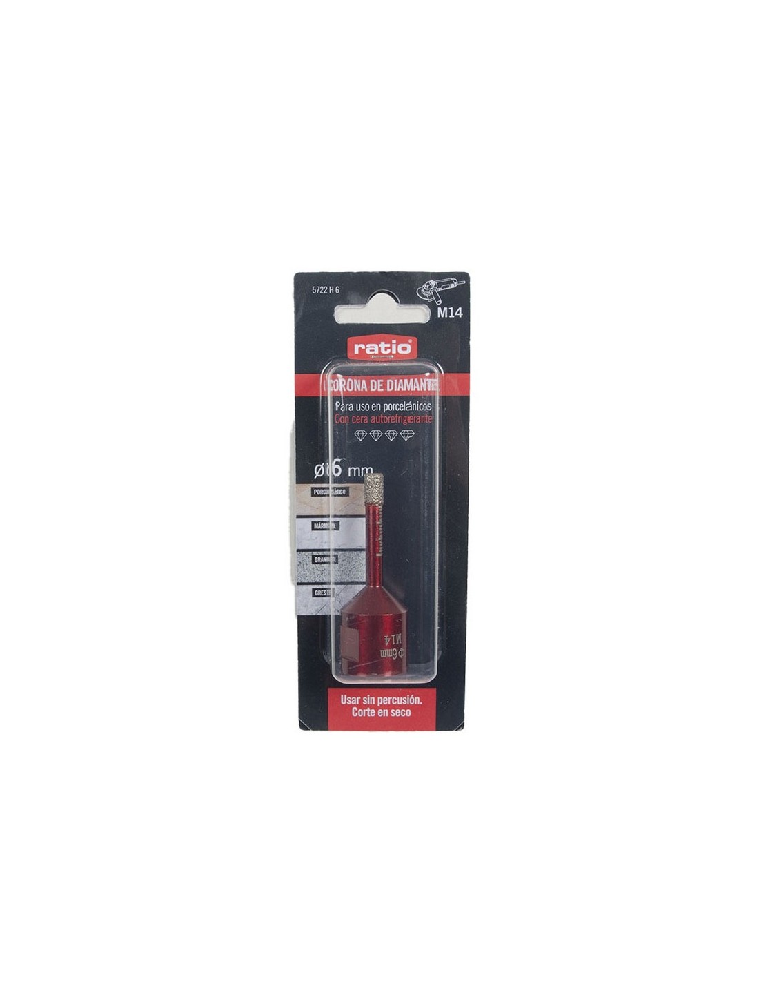 Sierra corona diamante para porcelánico RATIO Corte de materiales duros, incluso Dekton, porcelánico y gres. Trabajos en seco y sin percusión. Rosca M-14. Corona milimetrada. ø 6, 8 y 10 mm incorporan en su interior una cera refrigerante para obtener mayor número de agujeros. (Si se acaba antes la cera que el diamante, se puede seguir usando refrigerando con agua). ø 6 mm.