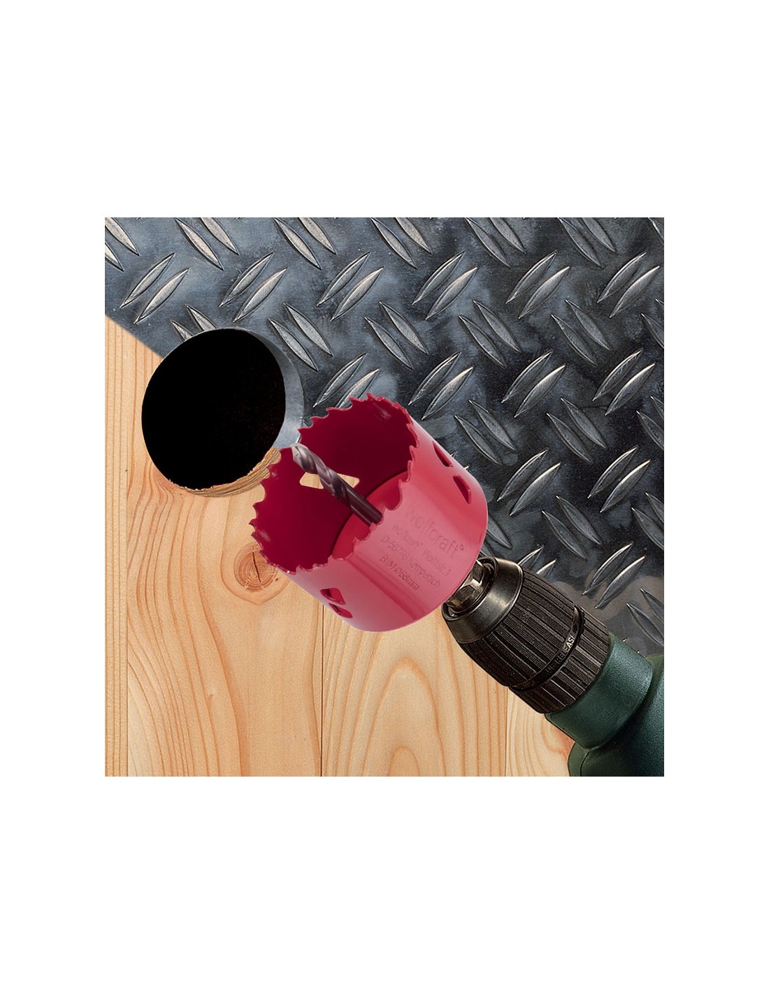 Sierra corona bimetal WOLFCRAFT Para el uso en madera, metal, plástico, placas para construcción en seco y de aislante (por ejemplo, placas de yeso y de OSB). Modelo con vástago hexagonal de 9,5 mm de diámetro y broca de centrado de 6 mm de diámetro, se puede emplear directamente. ø 20 mm. Vástago 9,5 mm Hex.