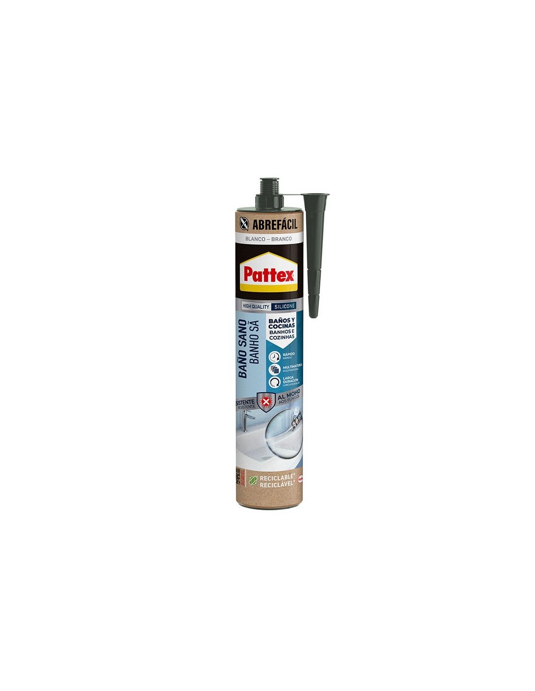 Silicona baños y cocinas PATTEX Baño sano Acética de un componente. Con alta resistencia al moho. Formulado para sellado de juntas de baños y cocinas. Compatible con pistolas convencionales.. Cartucho. 280 ml. Blanco.