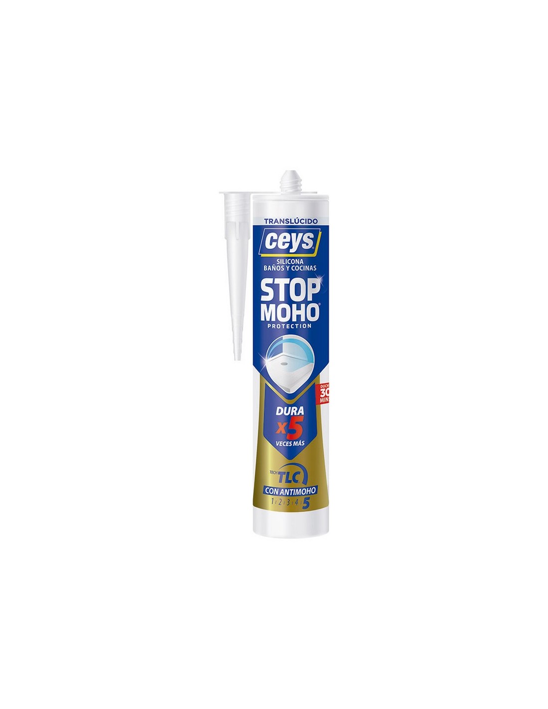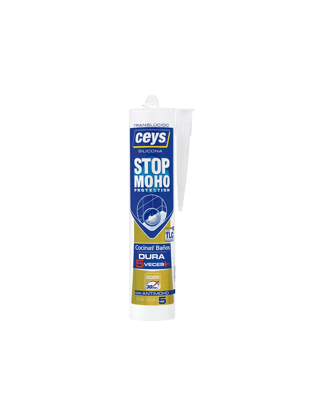 Silicona antimoho CEYS Stop Moho. Silicona de alta calidad que evita filtraciones de agua y humedad. Conserva las juntas blancas e impecables hasta 5 veces más gracias a su tecnología anti-moho TLC (liberación controlada). Blanca. Cartucho 300 ml.