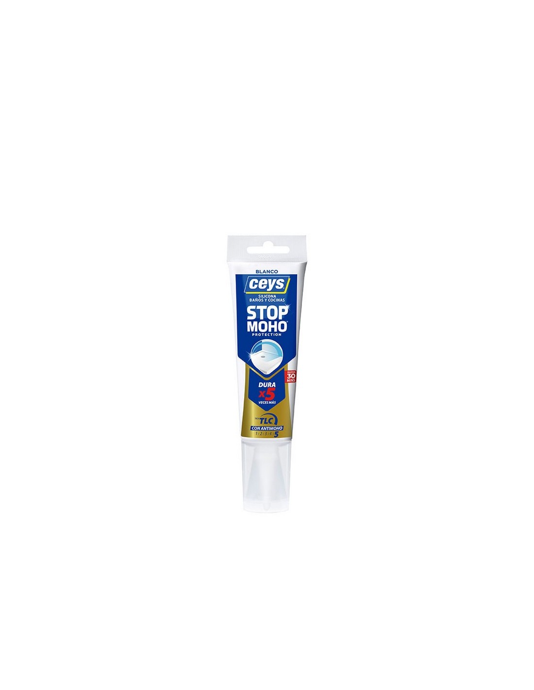 Silicona antimoho CEYS Stop Moho. Silicona de alta calidad que evita filtraciones de agua y humedad. Conserva las juntas blancas e impecables hasta 5 veces más gracias a su tecnología anti-moho TLC (liberación controlada). Blanca. Tubo 125 ml.